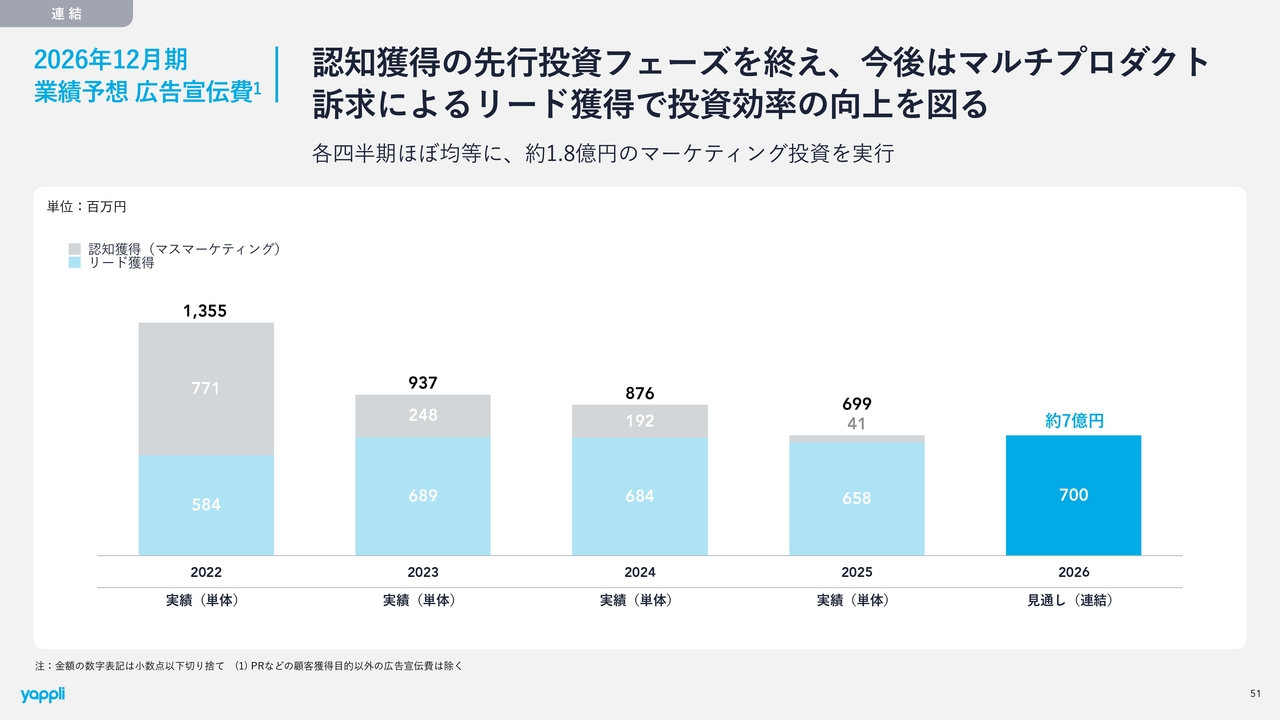 広告宣伝費ですが、来期は約7億円を計画しています。ただし、従来とは異なり、マスマーケティングは基本的に行わない方針で現時点では考えています。代わりに、リード獲得広告を中心に、さまざまなマーケティング活動を拡充していきます。