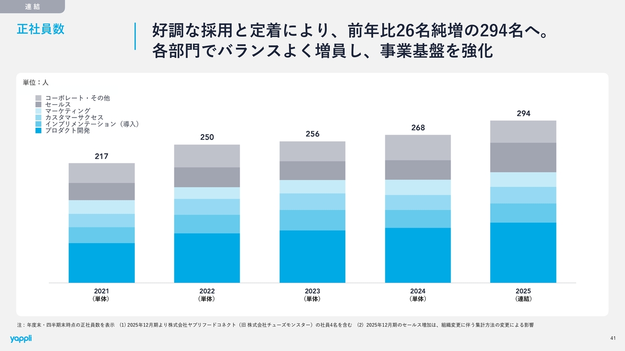 正社員数は、ヤプリフードコネクト社などの子会社も含め、連結で294人です。2025年は採用を強化し、前年比26名増加の294名となっています。