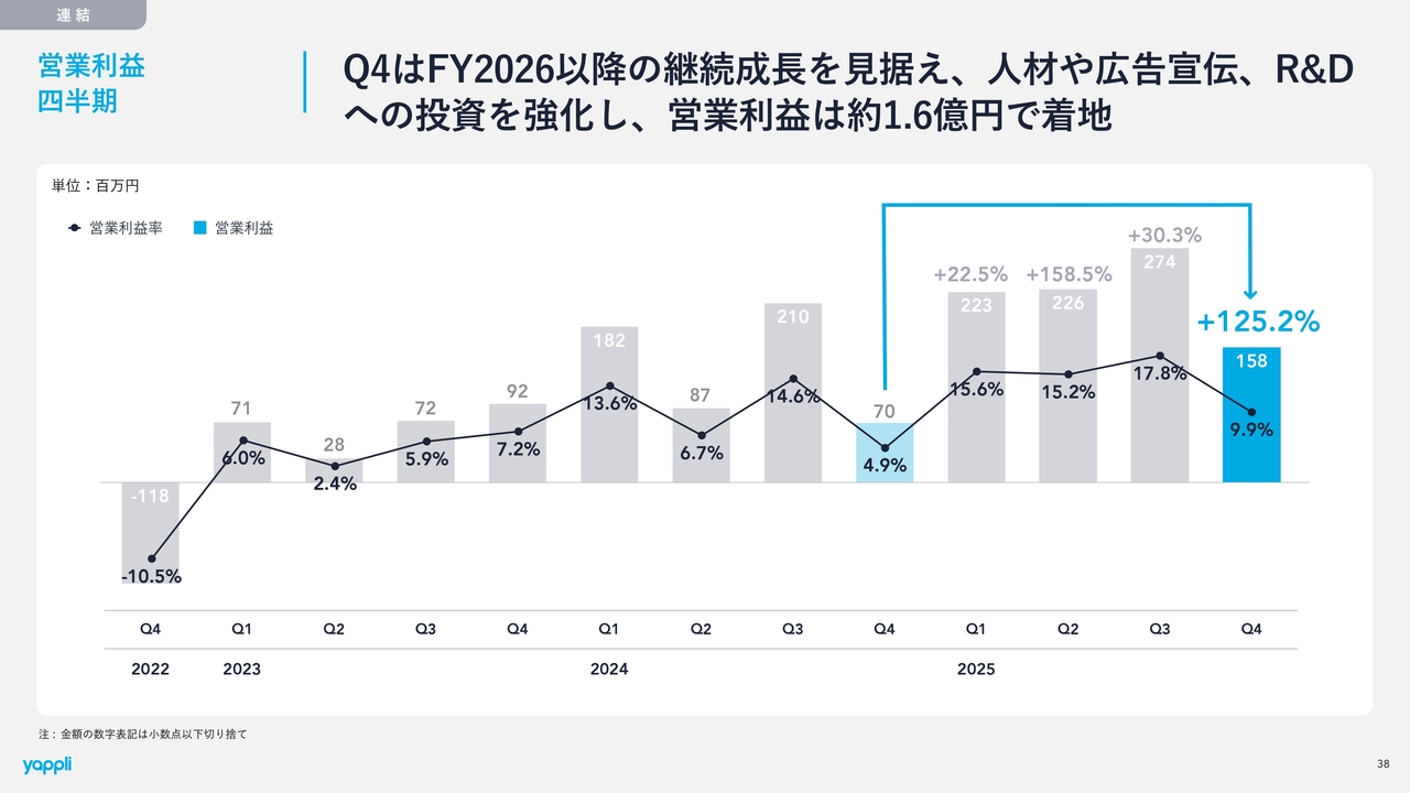 四半期ごとの営業利益です。今回は今年のほかの四半期と比べると1億5,800万円と減少しています。これは2026年に向けて人材、広告宣伝、R&Dなどへ先行投資によるものです。最終的に約1億6,000万円での着地となっています。