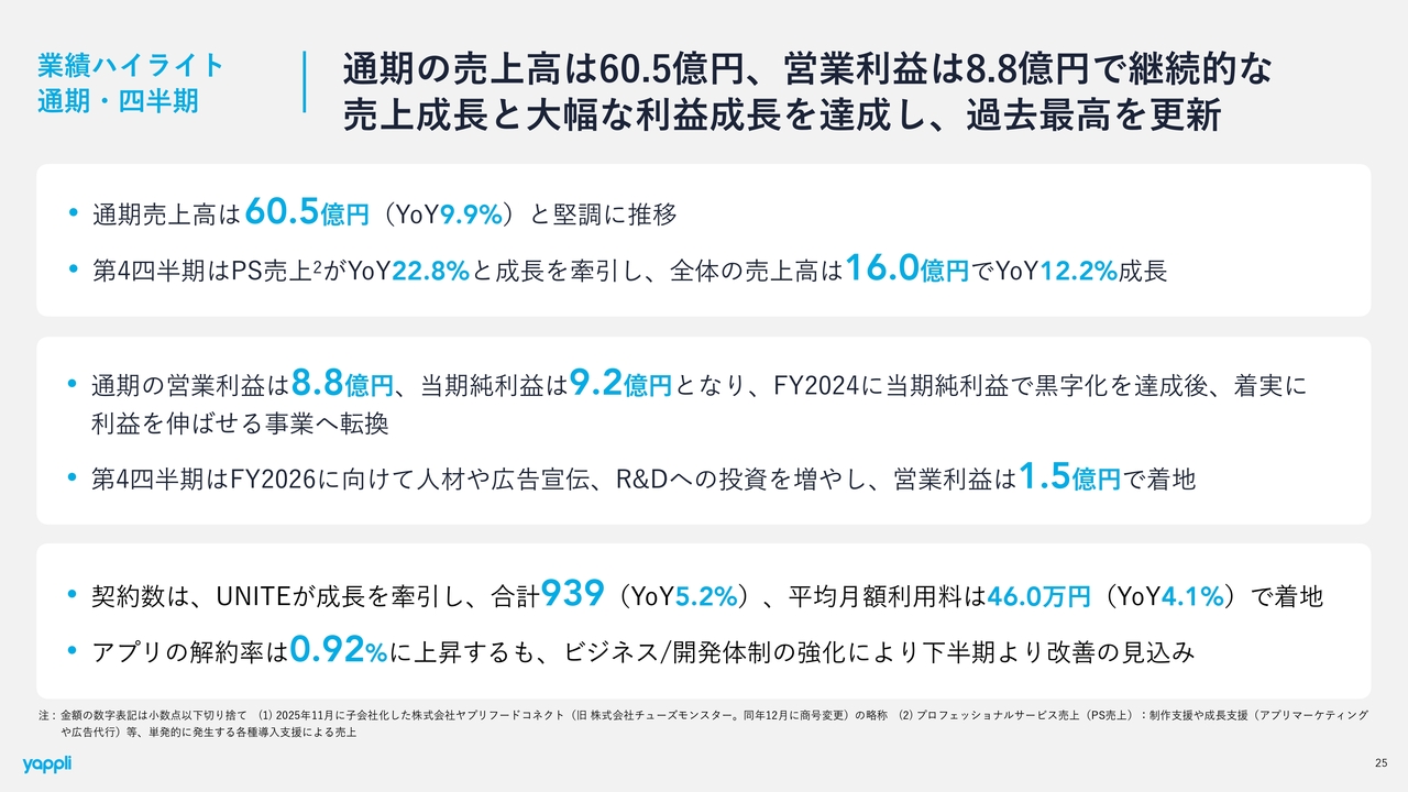 2025年12月期の通期および直近第4四半期の業績をご説明します。まず、2025年12月期より、株式会社チューズモンスター(現 株式会社ヤプリフードコネクト)のグループインにより、連結決算体制へと移行しました。