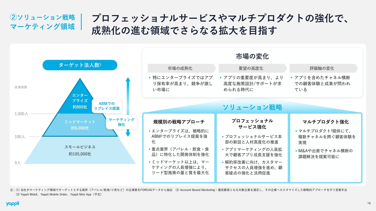 ターゲット法人数は、スライド左側の図に示しています。エンタープライズの800社にはABM(アカウント・ベースド・マーケティング)という営業手法により、既存アプリのリプレイスなど高度な提案活動を強化していきます。