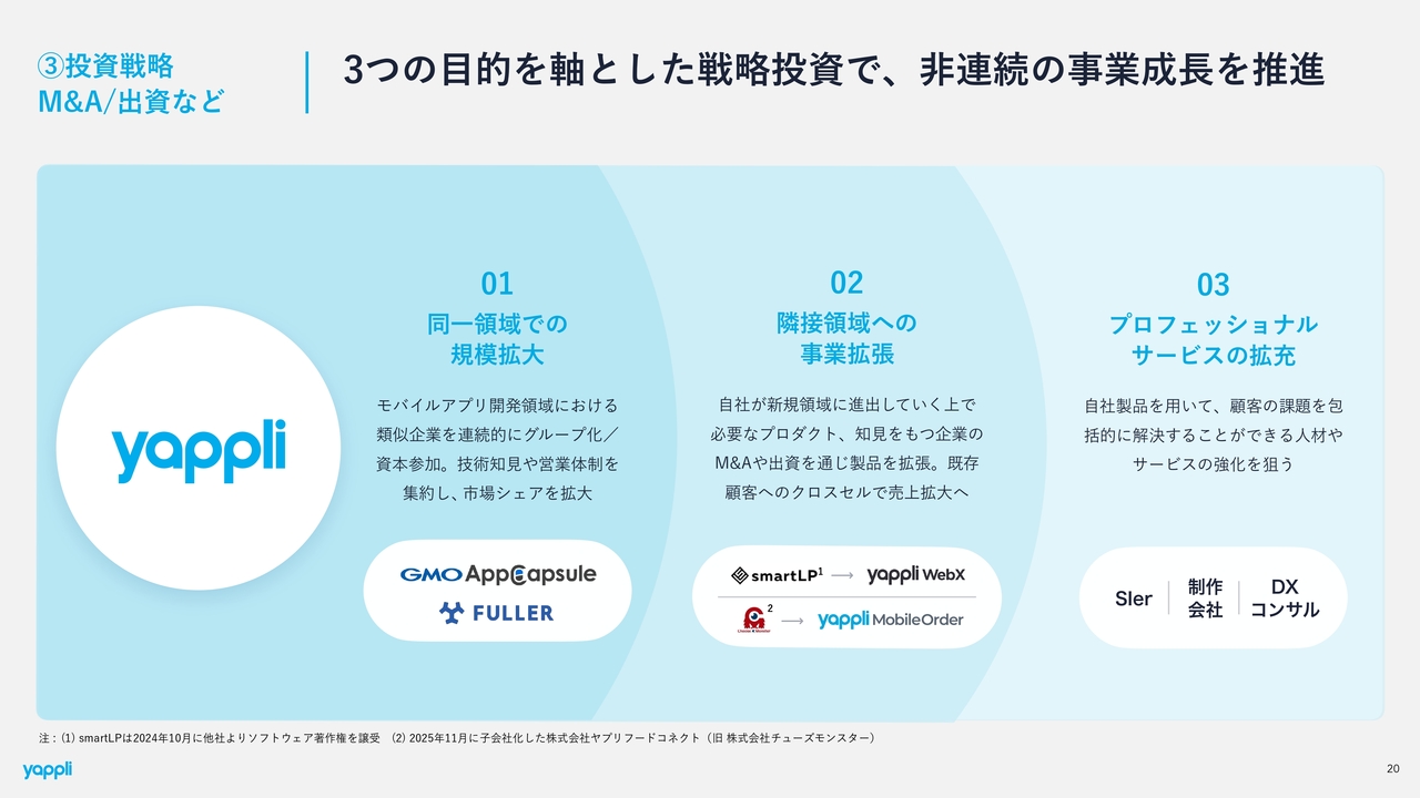 1つ目の軸として、同一領域での規模拡大を図っています。2019年にはGMO TECH社の「GMOアップカプセル」という製品の譲渡を受け、2024年にはフラー社との資本提携や2025年に株式会社チューズモンスター(現 株式会社ヤプリフードコネクト)の株式取得し、グループ会社化を実現しています。
