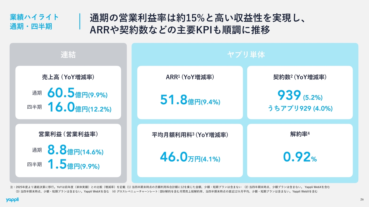 今述べた内容の多くは、こちらのスライドの業績ハイライトにも記載しています。通期の営業利益率は約15パーセントと高い収益性を実現しており、ARRや契約数などの主要KPIも順調に推移しています。