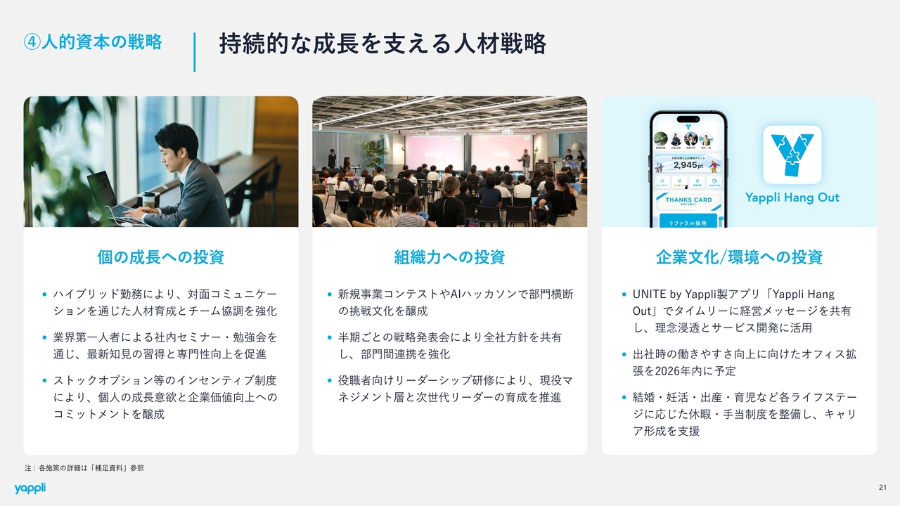 成長戦略の4つ目、人的資本への投資をご説明します。持続的な成長を支える人材戦略として、個々人の成長への投資を掲げるとともに、組織力を強化するためさまざまな取り組みを行っています。また、ヤプリは非常にユニークな企業文化を持っており、そうした文化や働く環境への投資も強化しています。