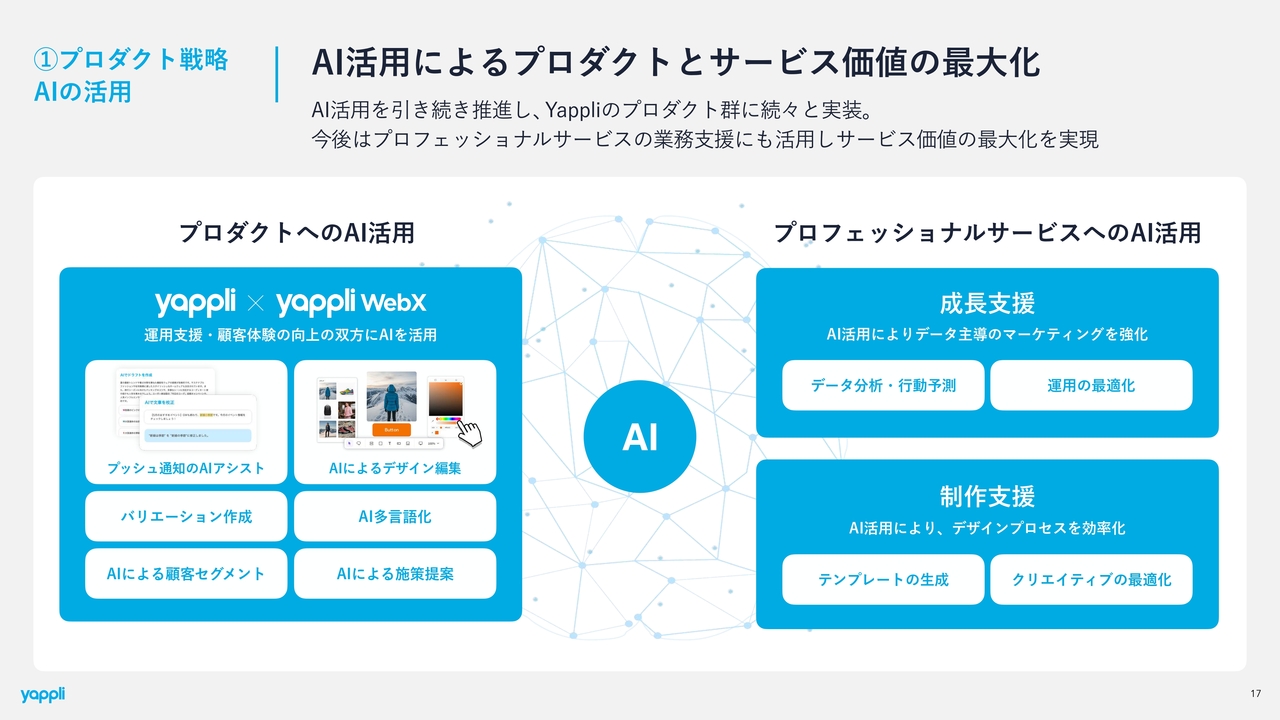 プロダクト戦略の3つ目として、AIの活用に力を入れています。具体的には、「Yappli」や「Yappli WebX」にさまざまなAI機能を導入し始めています。これらをさらに強化するとともに、プロフェッショナルサービスへのAI活用も今後進める予定です。