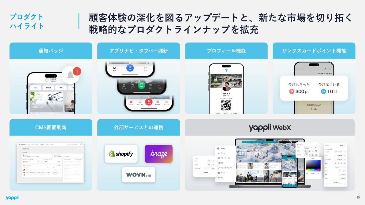 プロダクトハイライトです。スライドにあるように、当社は1年を通して多数の製品を提供してきました。アプリだけでなく、「Yappli WebX」を含むさまざまな製品のローンチや、継続的な機能追加も実施しています。
