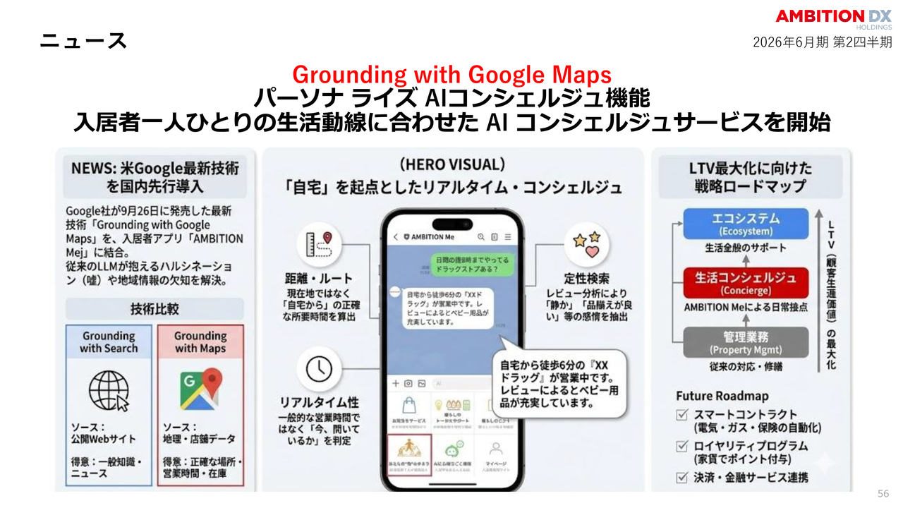 アメリカGoogle社の最新技術「Grounding with Google Maps」を国内で先行導入しました。「AMBITION Me」と統合することで、従来のAIが抱えていた情報の不正確さを解消し、自宅を起点としたリアルタイムの周辺案内や店舗情報を提供することで、入居者さまにこれまでにない利便性をもたらします。