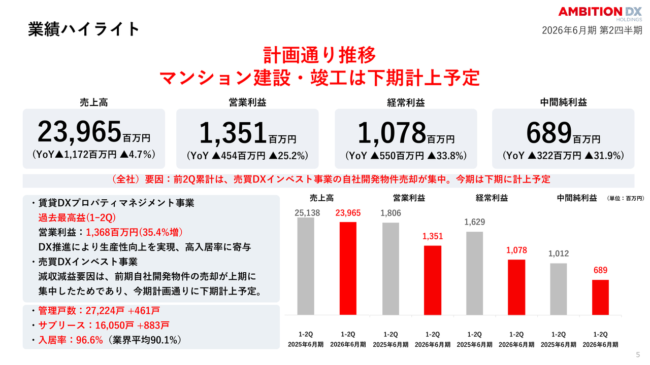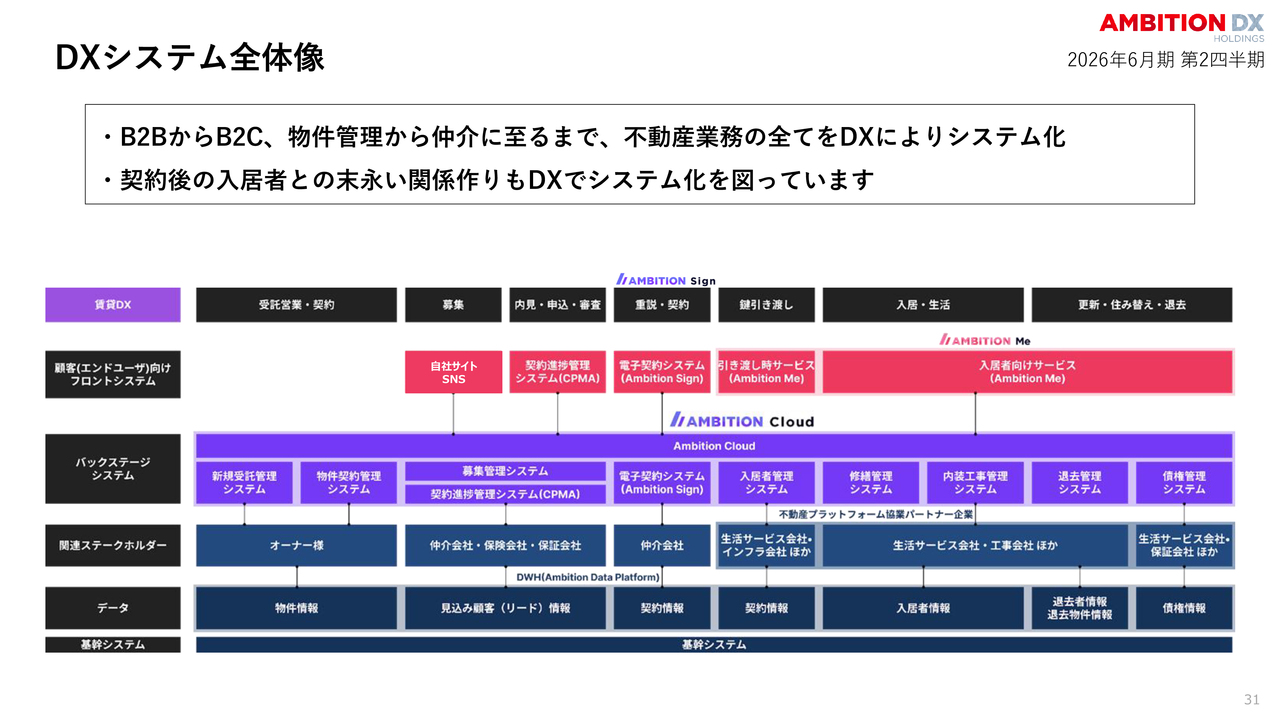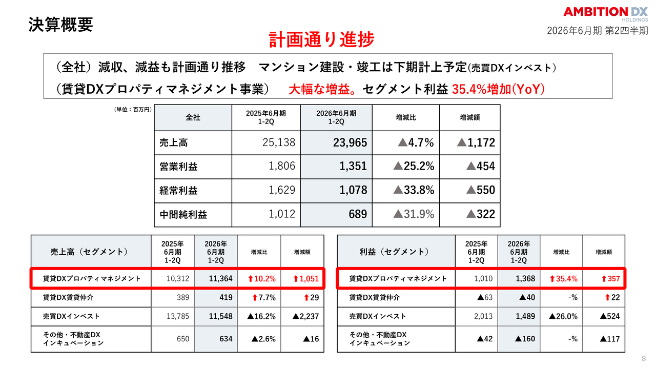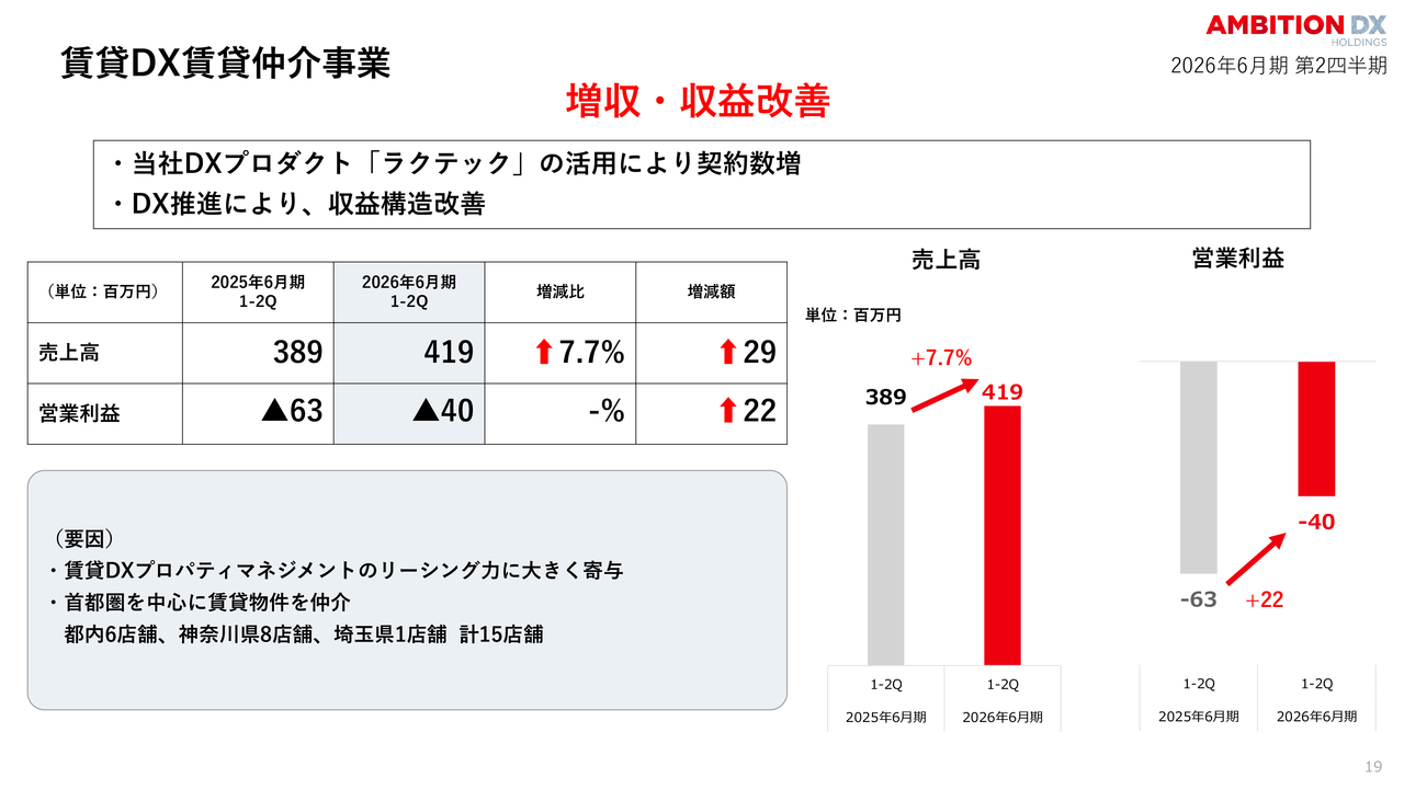 一方、賃貸DX賃貸仲介事業の収益改善やDXによる効率化が利益の底上げに寄与しています。これは計画どおりの推移であり、通期達成に向けた準備は整っていると考えています。