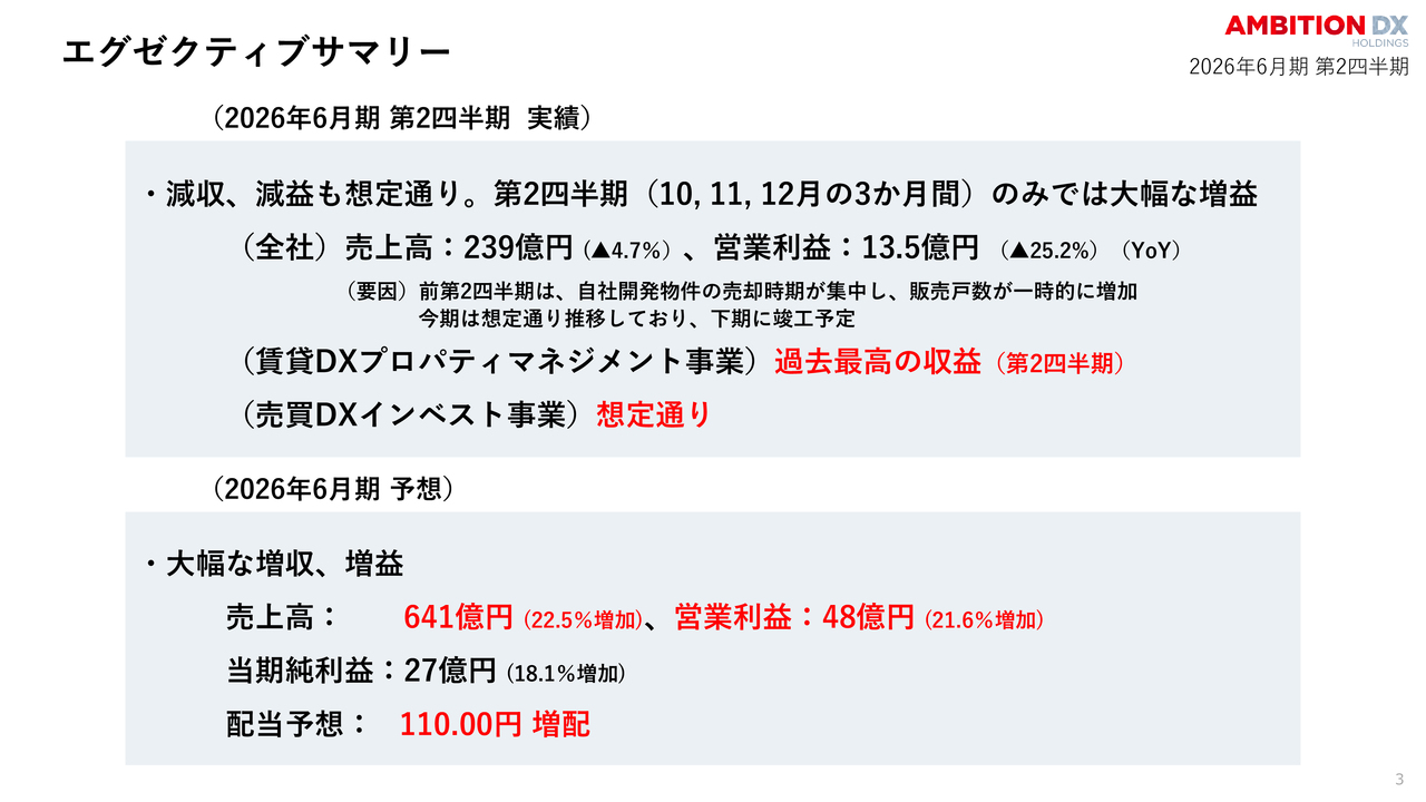 清水剛氏(以下、清水):株式会社アンビション DX ホールディングス、代表取締役社長の清水です。みなさま、本日は2026年6月期第2四半期決算説明会にご参加いただき、誠にありがとうございます。
