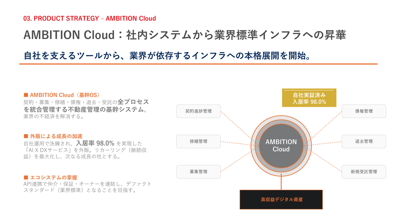 DXプロダクト戦略の核となる「AMBITION Cloud」についてです。これは受託、募集、契約、修繕、債権、退去といったすべてのプロセスを統合管理する不動産管理の基幹システムです。自社運用で洗練され、入居率98パーセントを実現したこのサービスを外販することで、収益の最大化を目指しています。また、API連携によって仲介業者やオーナーとも連携し、デファクトスタンダード、すなわち業界標準となることを目指しています。