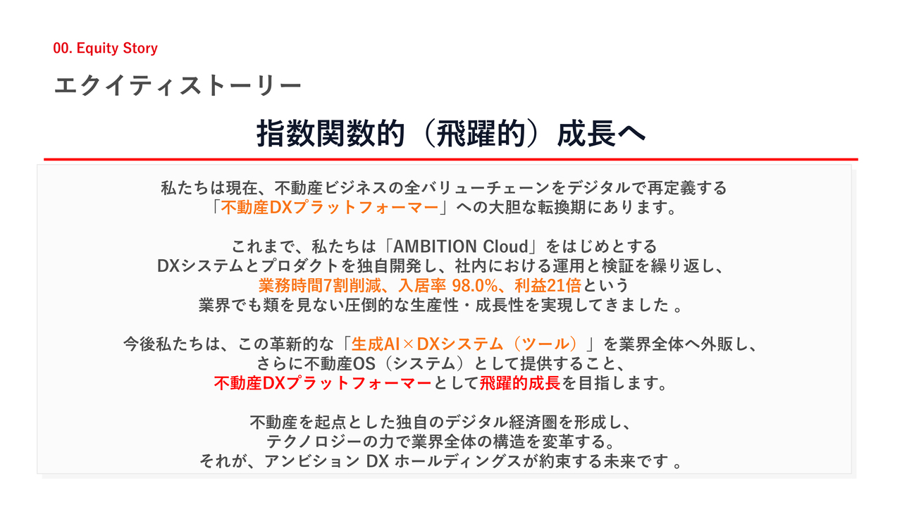 これまで、独自開発した「AMBITION Cloud」などのDXシステムを自社で運用・検証し、業務時間を7割削減、入居率98パーセント、営業利益21倍という圧倒的な生産性と成長性を実現してきました。