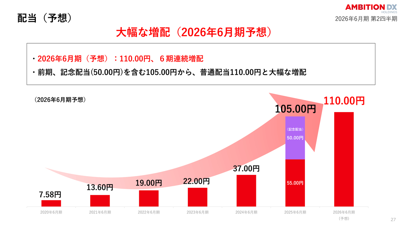 配当についてです。前期は記念配当を含めて105円でしたが、今期は普通配当のみで110円への増配を見込んでいます。これにより、6期連続の増配となります。