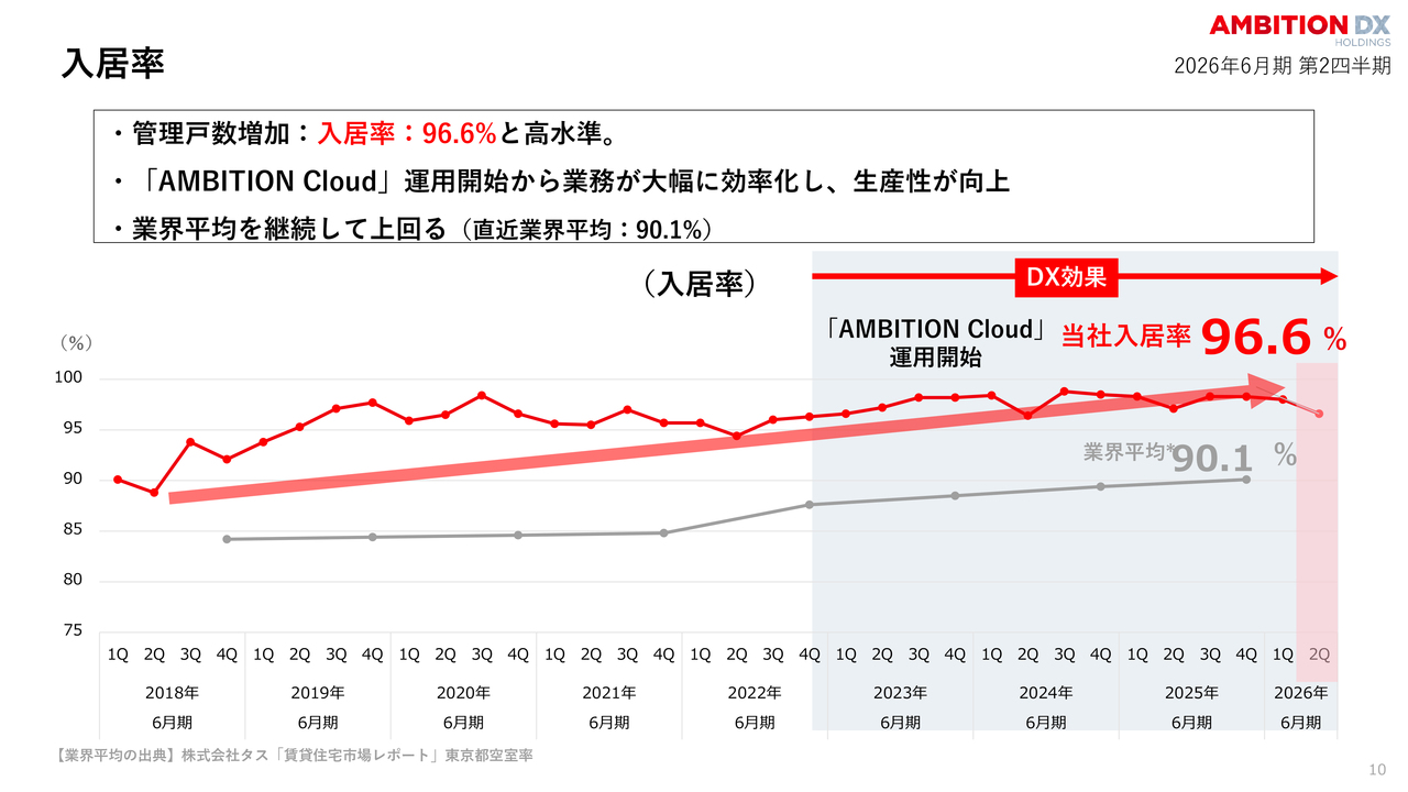 入居率は96.6パーセントと、業界平均の90.1パーセントを大きく上回る高水準を維持しています。