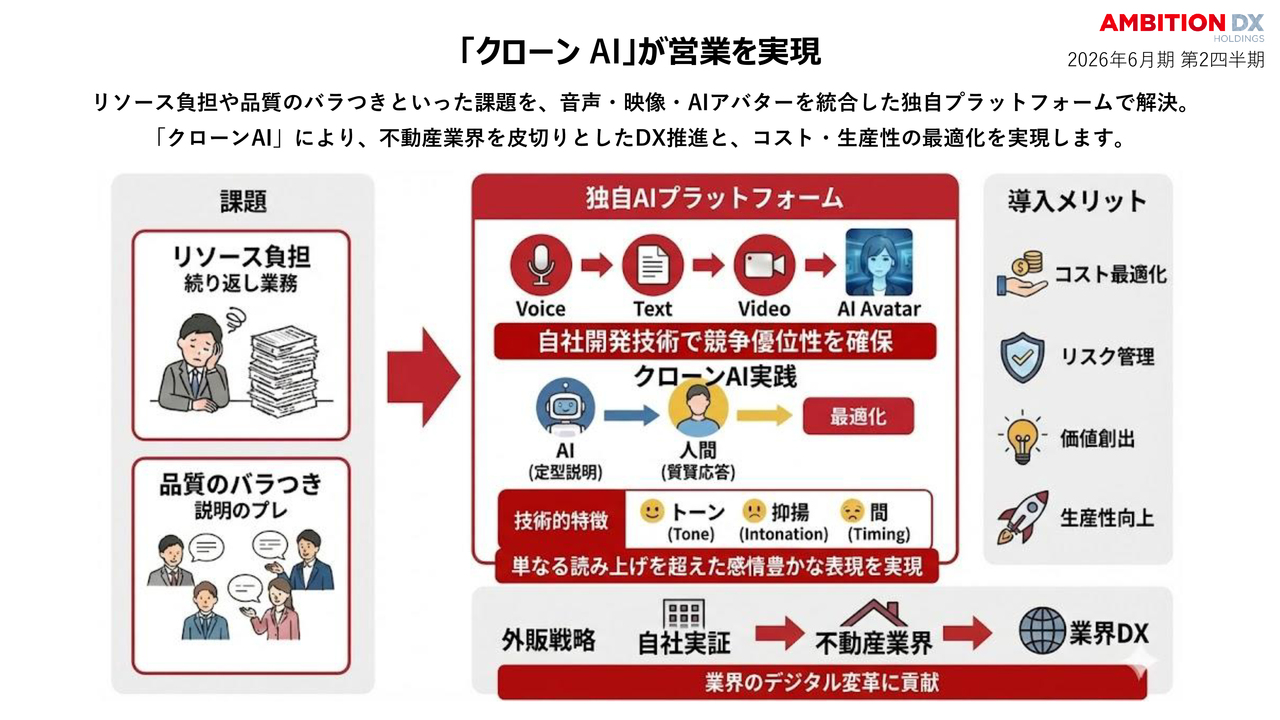 最新のニュースです。知識と話し方を学習したAIアバターが営業を担当する「クローンAI」を開発しました。これにより、説明のブレを防ぎ、24時間365日、高水準な営業が可能となります。これは外部ツールに依存しない、当社独自の技術です。