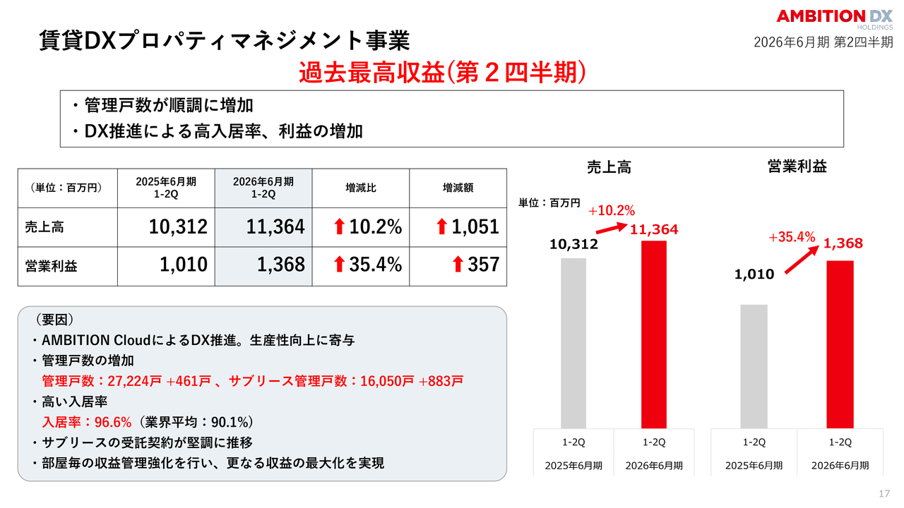 特筆すべきは、賃貸DXプロパティマネジメント事業が第2四半期として過去最高の収益を更新した点です。