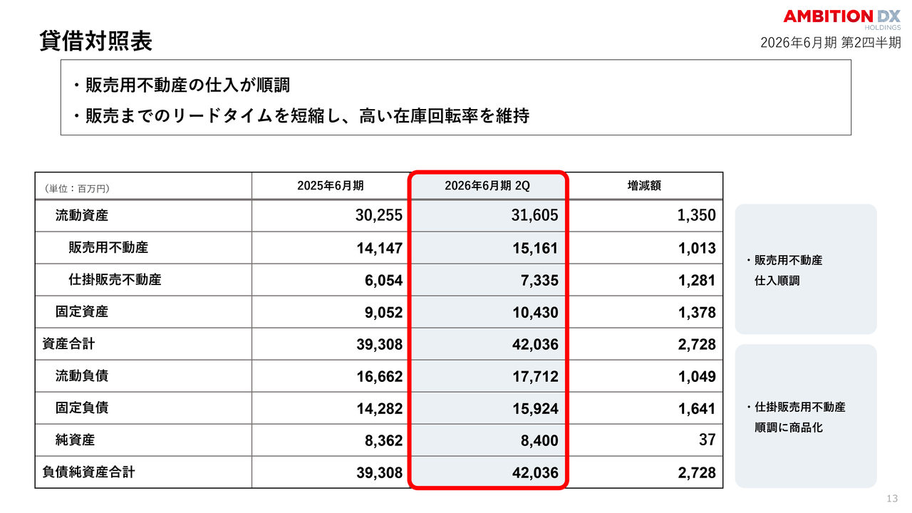 特筆すべき点は、販売用不動産および仕掛販売用不動産が順調に積み上がっていることです。高い在庫回転率を維持しつつ、良質な物件の仕入れが進んでいます。