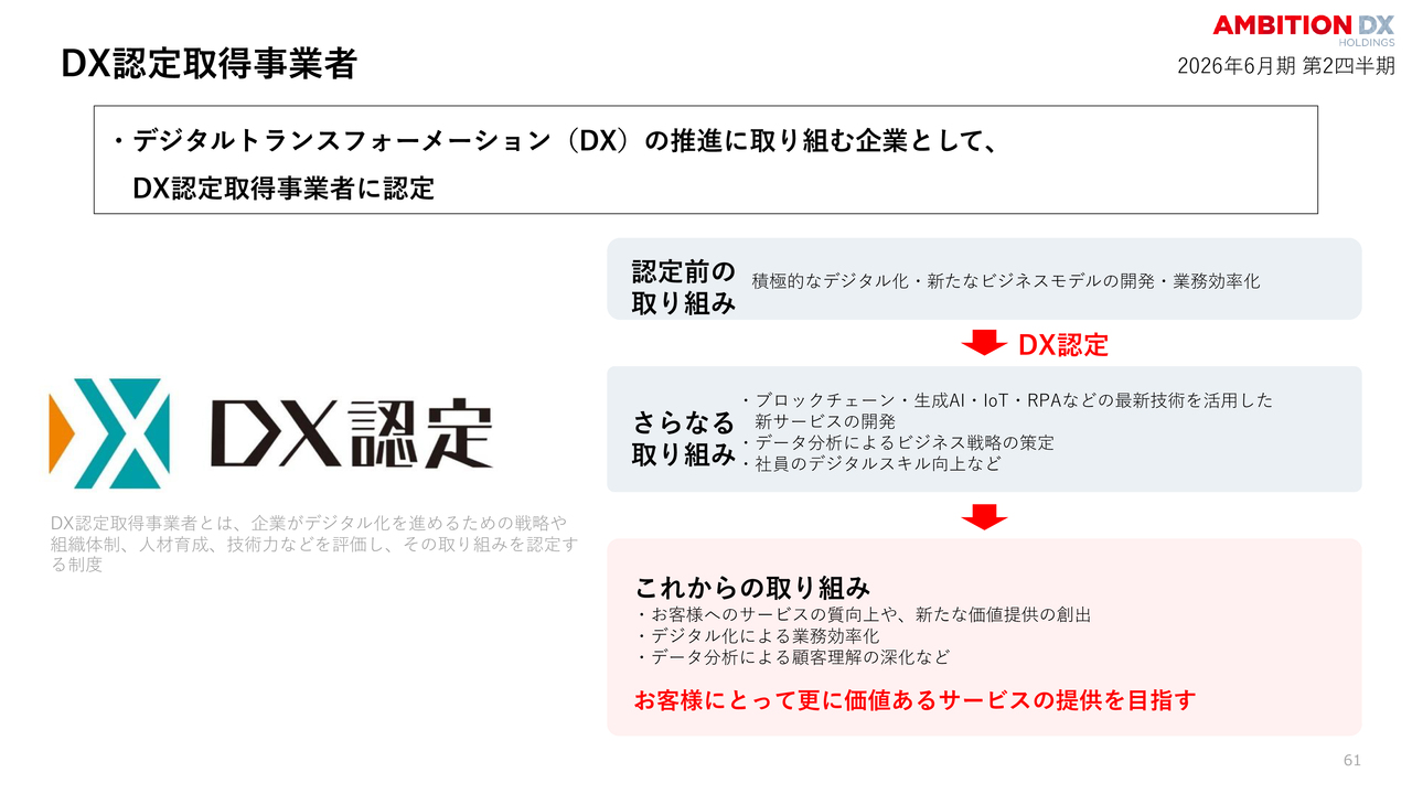 また、DXの活用により人員は増えていますが、1人あたりの生産性が大幅に向上しているため、利益率がさらに高まると見込んでいます。加えて、持続性も大きく向上すると自信を持っています。