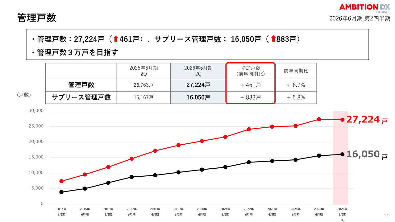 管理戸数についてです。管理戸数は2万7,224戸と着実に積み上がり、前年同期比で6.7パーセント増加しました。サブリース管理戸数も前年同期比で5.8パーセント増加しています。