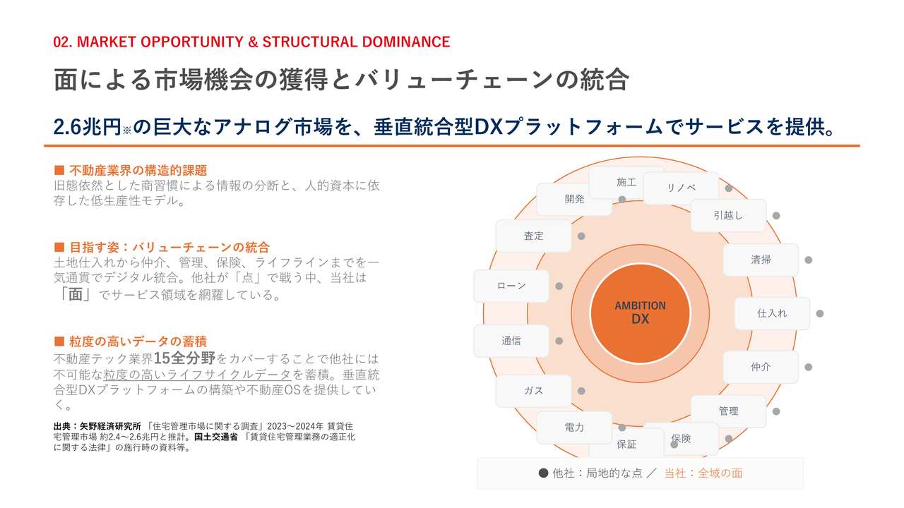 市場機会についてご説明します。当社は現在、2.6兆円規模の巨大なアナログ市場に対し、垂直統合型DXプラットフォームを通じてサービスを提供しています。他社が局地的な「点」で競争している中、当社は仕入れ、仲介、管理、さらには保険やライフラインまで、不動産テックのバリューチェーン全域を「面」で網羅しています。