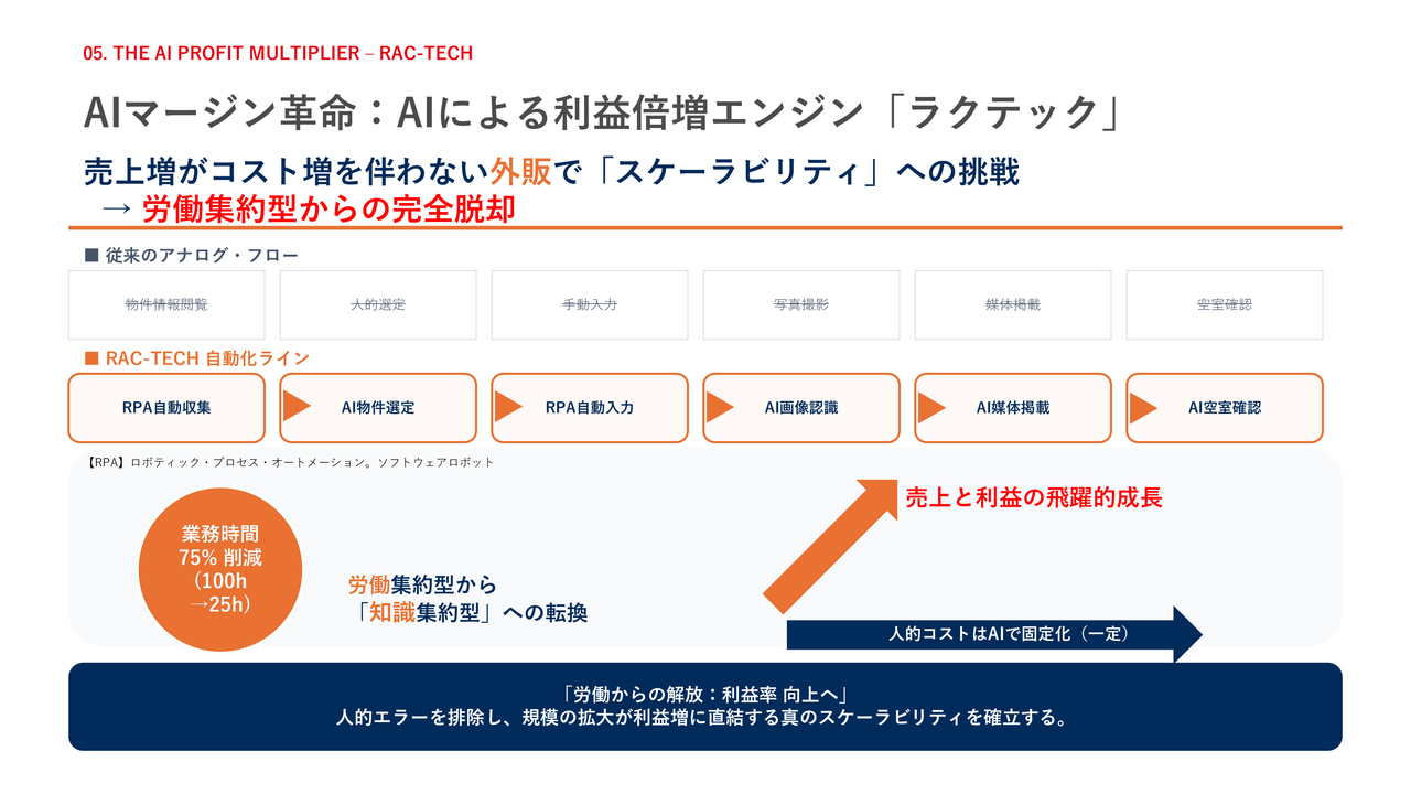 利益率を劇的に向上させるAIによる利益倍増エンジン「ラクテック」についてです。従来のアナログなフローをRPAとAIによる自動化ラインへ置き換えることで、業務時間を75パーセント削減します。これにより、人的コストを固定化したまま、売上増がコスト増を伴わないスケーラビリティを確立します。