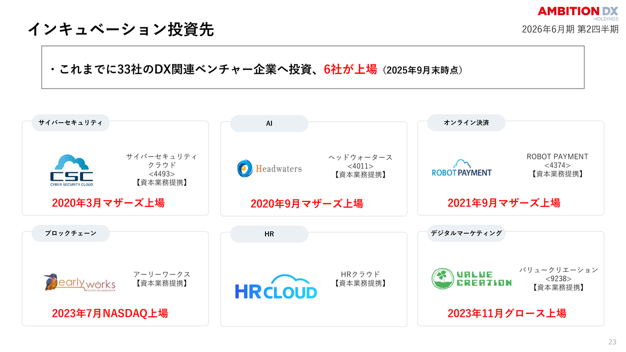 当社の成長を支えるもう1つの柱がインキュベーション事業です。これまでに33社のDX関連ベンチャー企業へ投資し、そのうち6社が上場を果たしました。