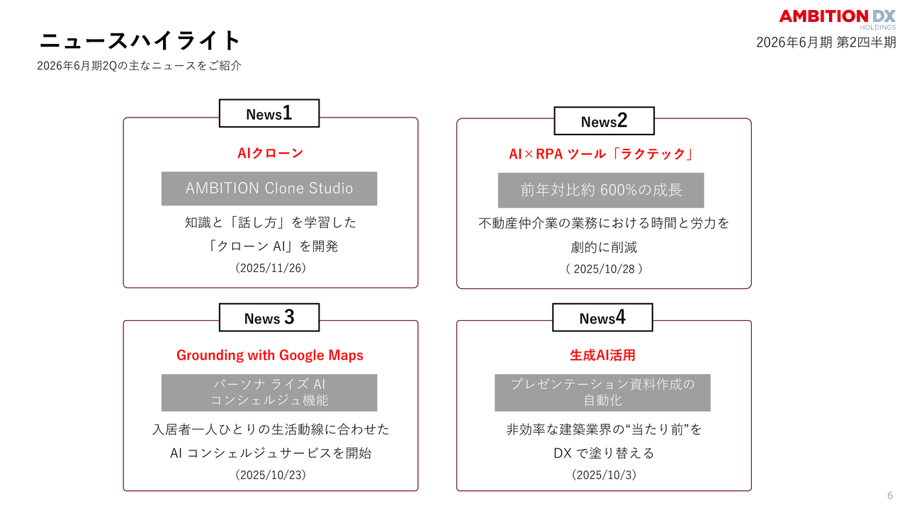 ニュースハイライトです。前年同期比で約600パーセントの急成長を遂げた「ラクテック」に加えて、本四半期ではAIクローンや「Googleマップ」連携のAIコンシェルジュなど、最先端技術の実装が大きく進みました。