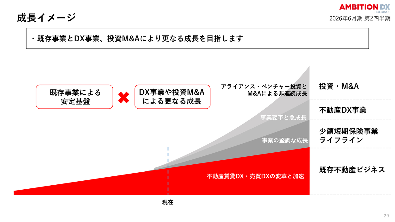 そして、未来を見据えた「戦略ロードマップ2026」、不動産DXプラットフォーマー戦略により、指数関数的な成長を目指していきたいと考えています。今後とも、株式会社アンビション DX ホールディングスへの変わらぬご支援を賜りますよう、よろしくお願い申し上げます。ご清聴、誠にありがとうございました。