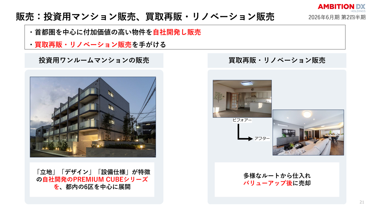 販売:投資用マンション販売、買取再販・リノベーション販売