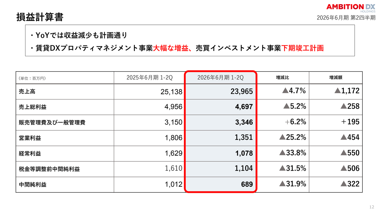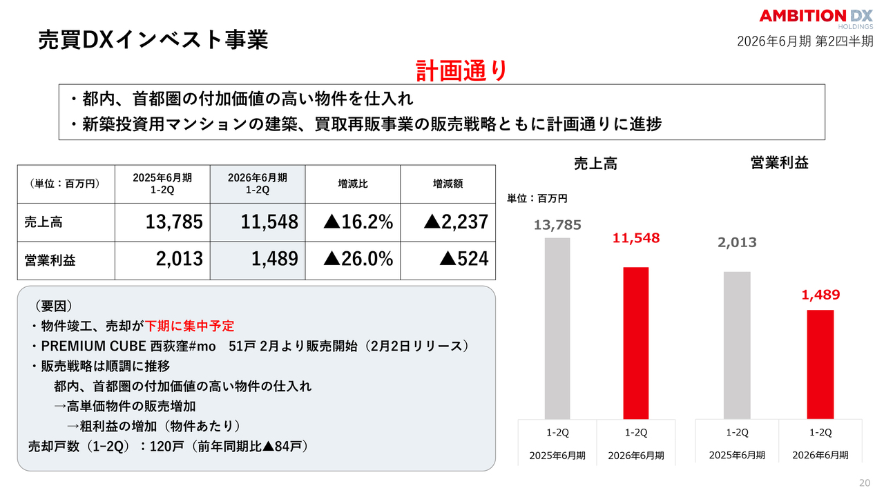前年同期比では減収減益に見えますが、前第2四半期に自社開発物件の売却が集中したことが要因です。今期の物件の竣工・売却は下期に予定しているため、すべて想定内の推移です。