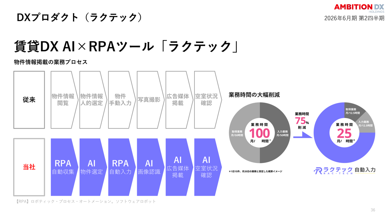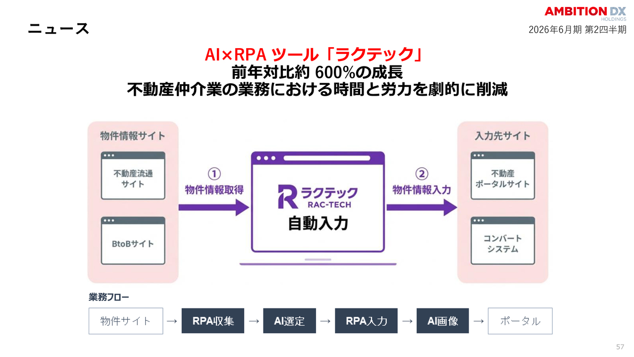 AIとRPAを駆使した「ラクテック」は、前年同期比600パーセントという爆発的な成長を遂げています。不動産仲介の現場に革命を起こしていると言っても過言ではありません。物件情報の収集から入力までを全自動化することで、膨大な時間と労力を劇的に削減し、業界全体が抱えていた長年の課題を解決していると考えています。