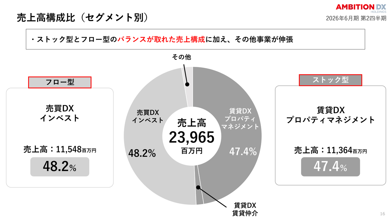 安定基盤であるストック型の賃貸DXプロパティマネジメント事業が、売上高の47.4パーセントを占めています。一方で、成長を加速させるフロー型の売買DXインベスト事業は48.2パーセントと、非常にバランスの良い構成となっています。