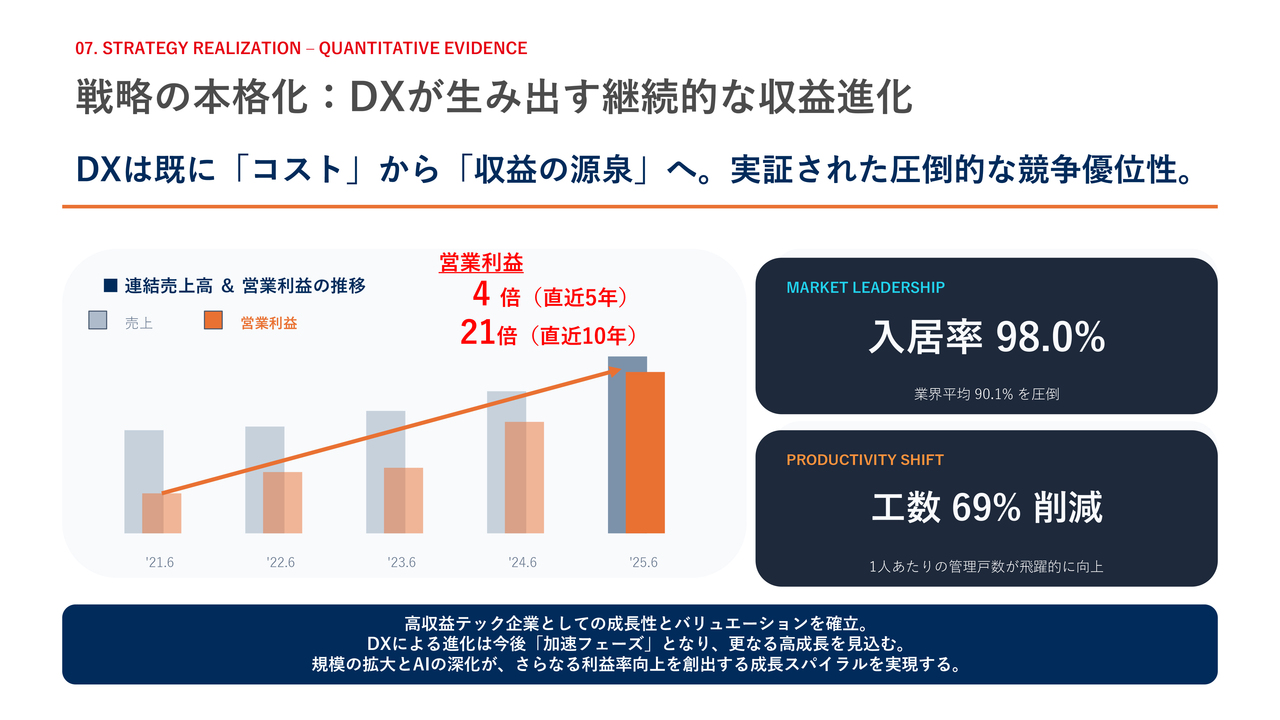 戦略の実現性を裏づける定量的なエビデンスについてです。当社にとってDXはすでに収益の源泉となっており、直近10年で連結営業利益は約21倍、直近5年では4倍と、圧倒的な成長を遂げています。また、入居率は98パーセント、工数は69パーセント削減を実現しています。