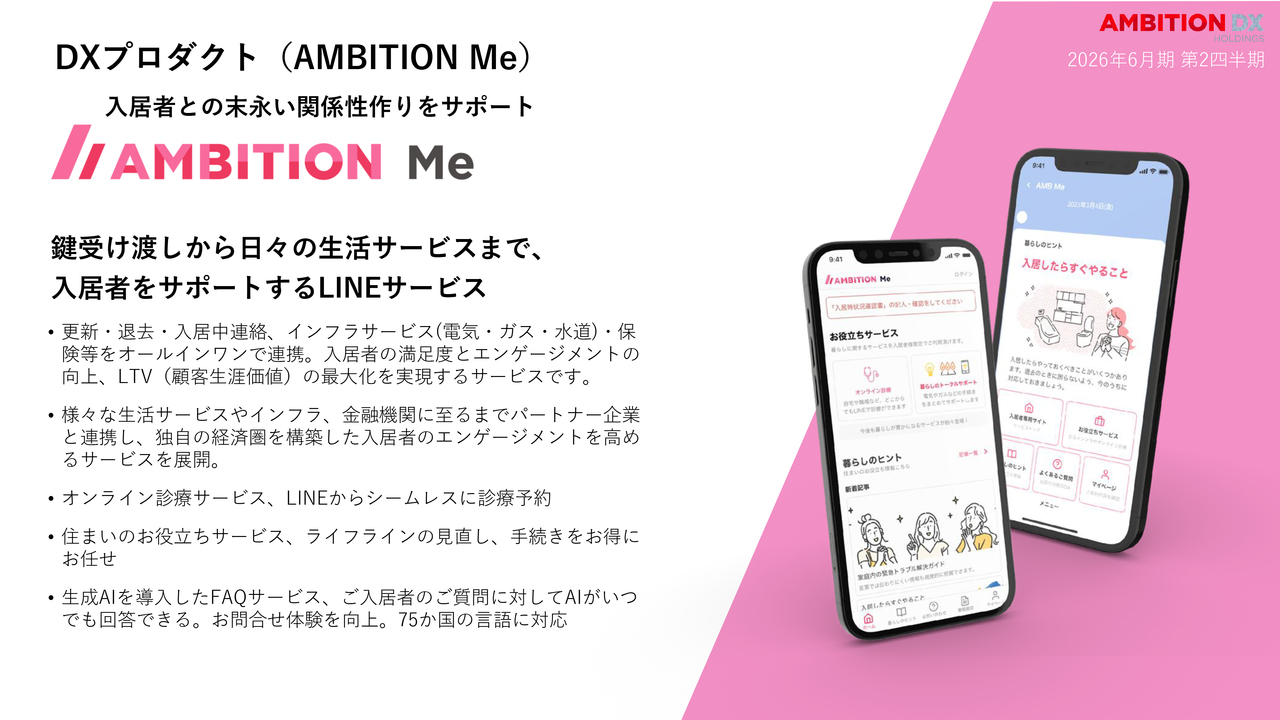 さらに、入居者専用アプリ「AMBITION Me」を通じて、インフラ、保険、AI FAQなどを統合した独自のアンビション経済圏を構築しています。入居期間中のあらゆるライフイベントを収益化し、従来の「点」の利益を、LTV(顧客生涯価値)を最大化する「面」の利益へと転換していきたいと考えています。