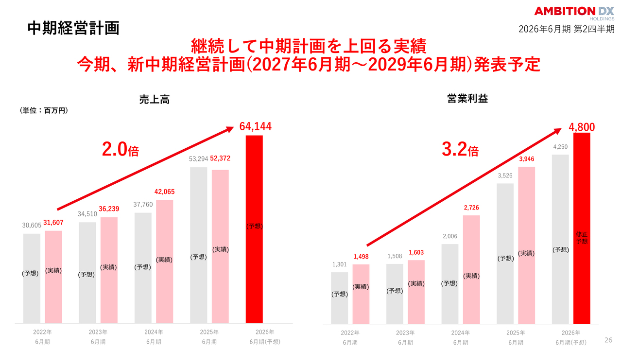 今期中には、2027年6月期からの新中期経営計画を発表する予定です。これまでの成長をさらに加速させ、指数関数的成長に向けた新たなシナリオをみなさまにお伝えできると考えています。