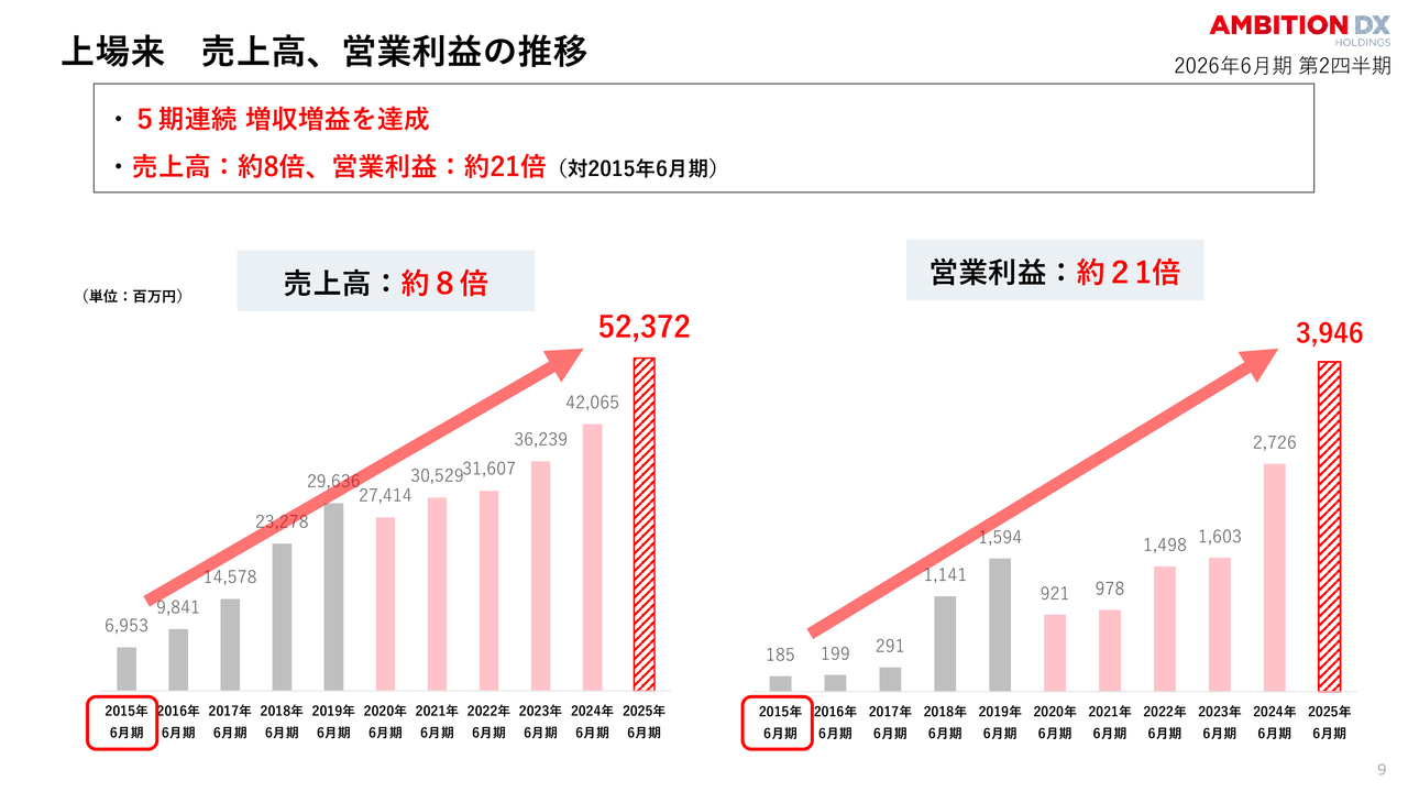 当社の長期的な成長軌道をご覧ください。2015年6月期と比較して、売上高は約8倍、営業利益は約21倍へと拡大しています。