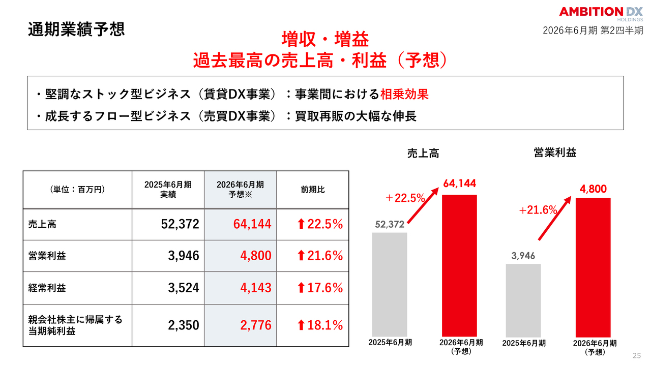堅調なストック型ビジネスと、大幅な成長が見込まれる不動産売買ビジネスの相乗効果により、過去最高の売上高と利益の達成を目指しています。