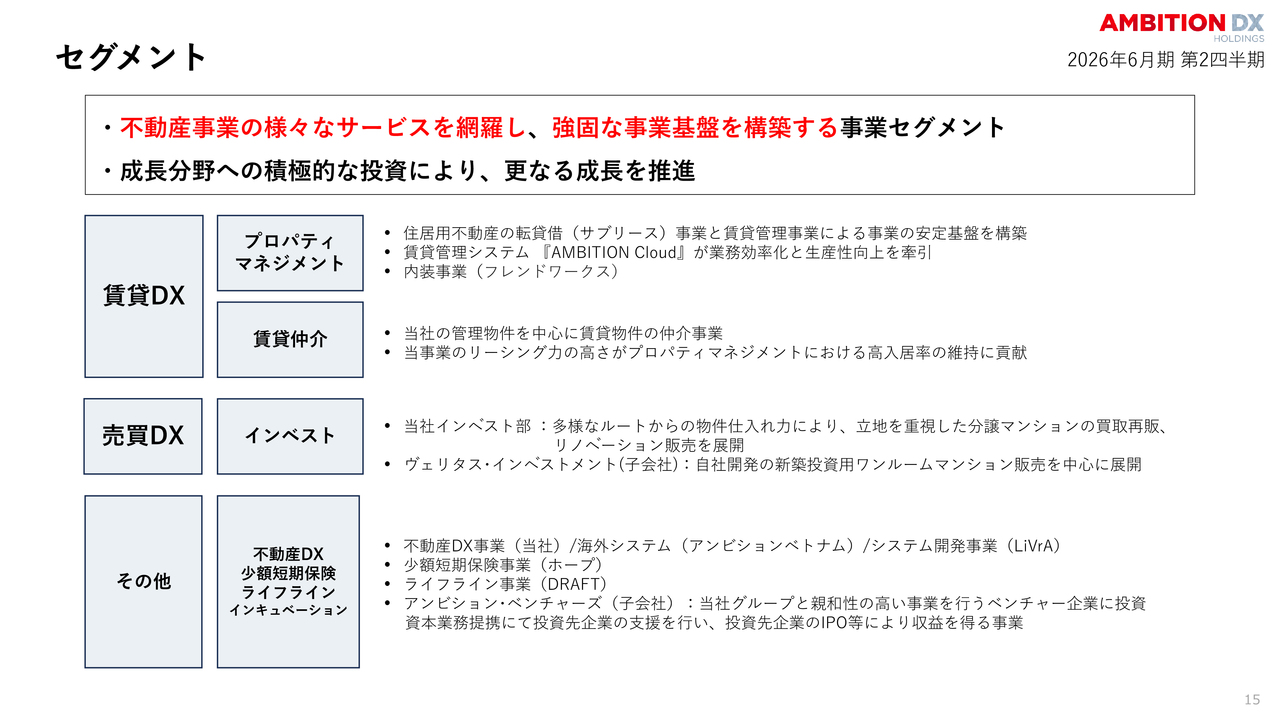 セグメントについての説明です。当社は、賃貸管理から売買・保険・テック領域までを網羅することで、景気変動に左右されない極めて強固な事業基盤を構築しています。