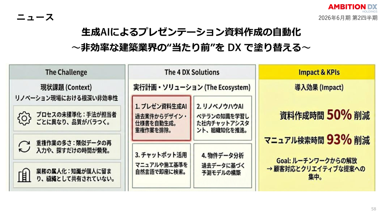 また、生成AIを活用したプレゼンテーション資料の自動作成を含めて、不動産業界の非効率を徹底的にDXで解消し、圧倒的な生産性向上を引き続き実現していきます。
