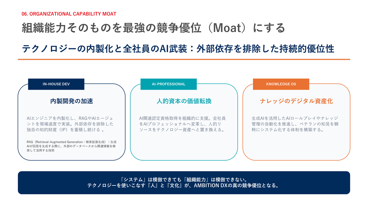 当社の真の競争優位は組織能力にあります。AIエンジニアの内製化を進める「内製開発の加速」、全社員をAIプロフェッショナルへと変革する「人的資本の価値転換」、そして生成AIを活用してベテランの知見をシステム化する「ナレッジのデジタル資産化」を推奨していきます。