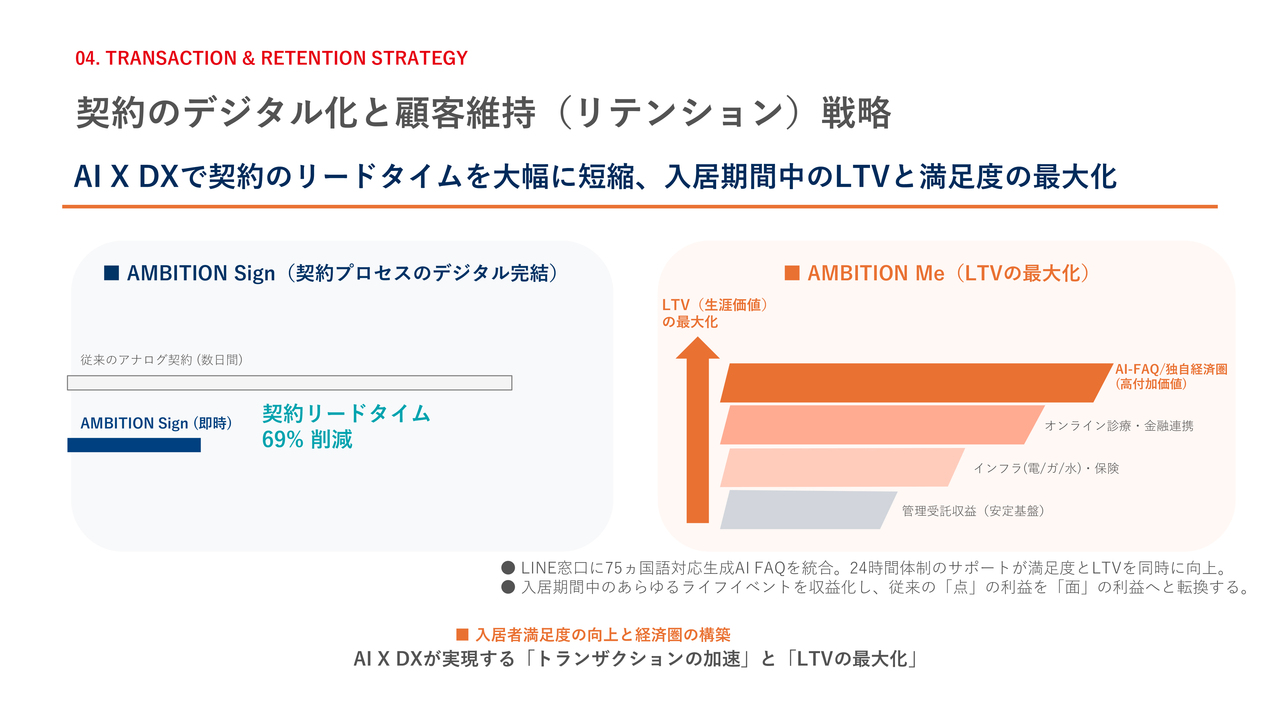 トランザクションの加速とLTV(顧客生涯価値)の最大化戦略についてです。「AMBITION Sign」により、契約のリードタイムを69パーセント削減しています。