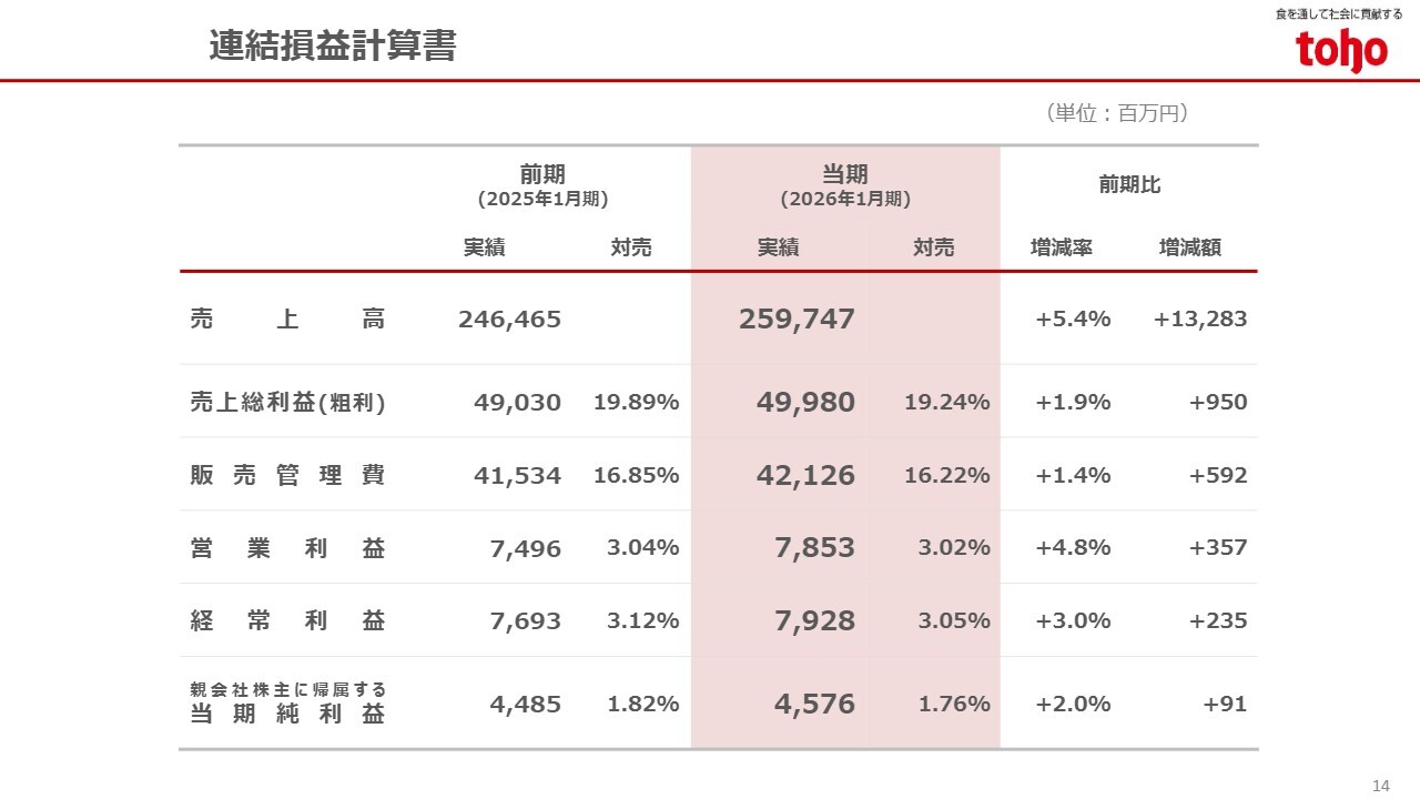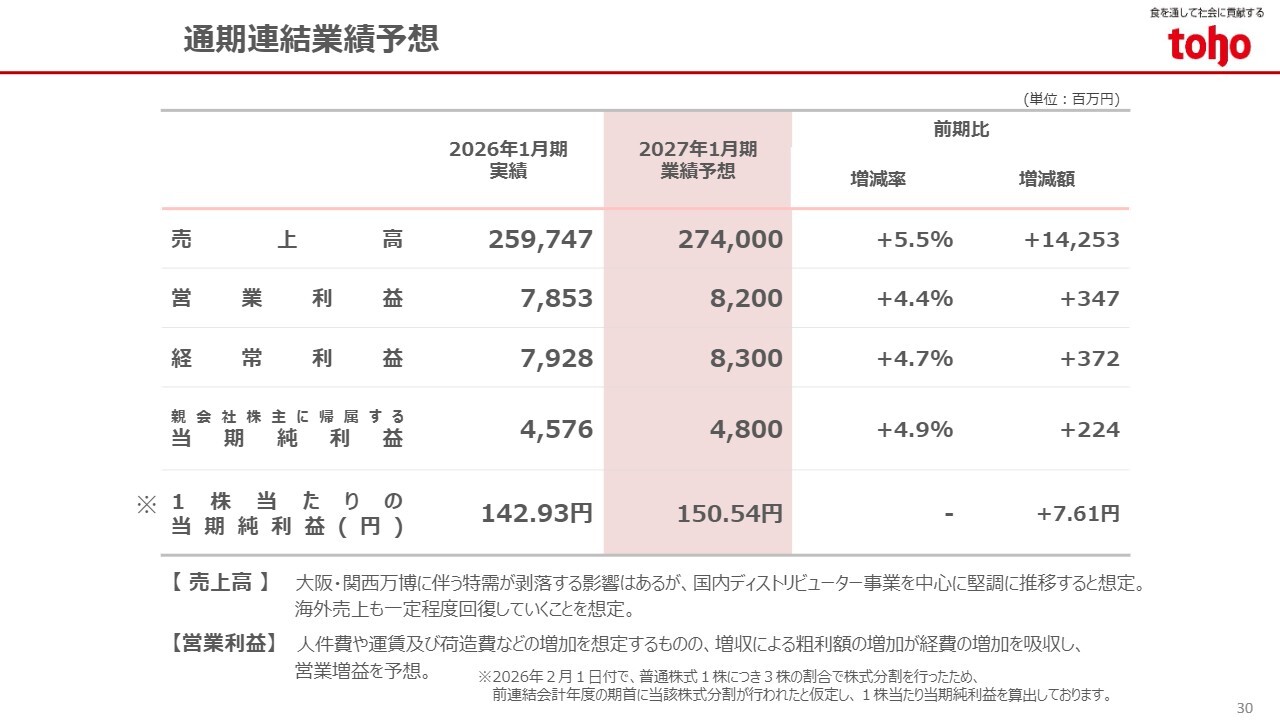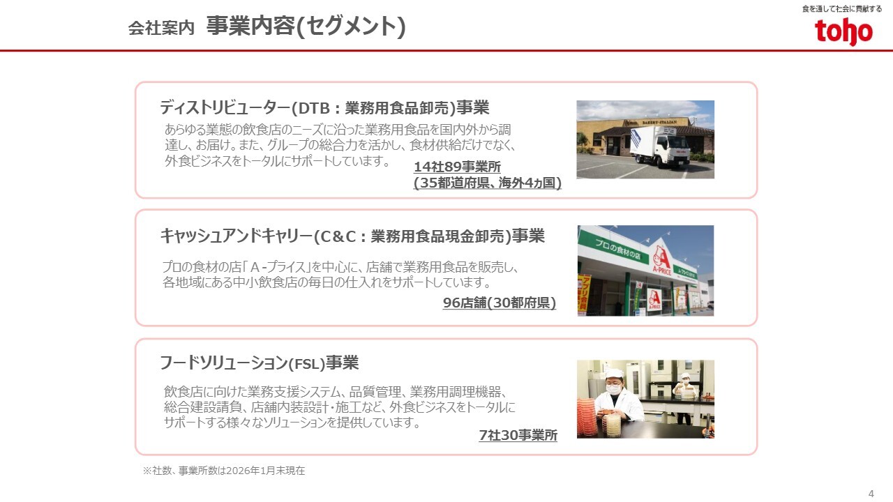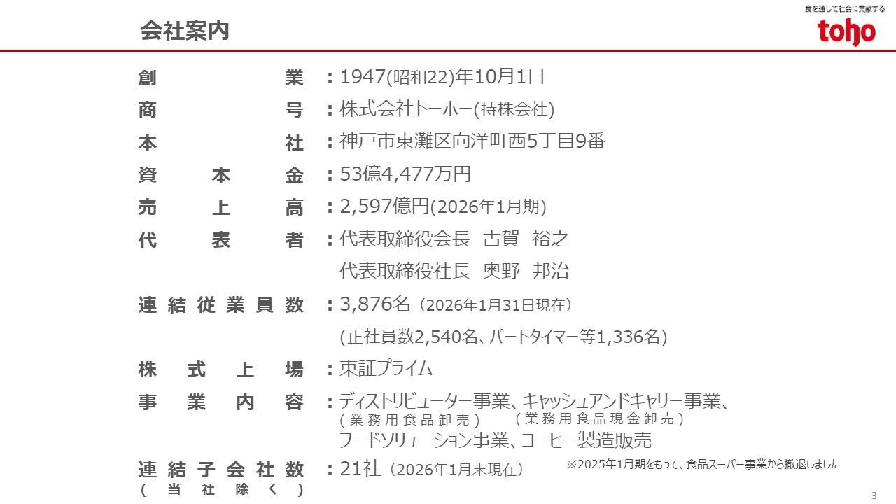 奥野邦治氏(以下、奥野):株式会社トーホー代表取締役社長の奥野です。本日はお忙しい中、当社の2026年1月期決算説明会にご出席いただき、誠にありがとうございます。