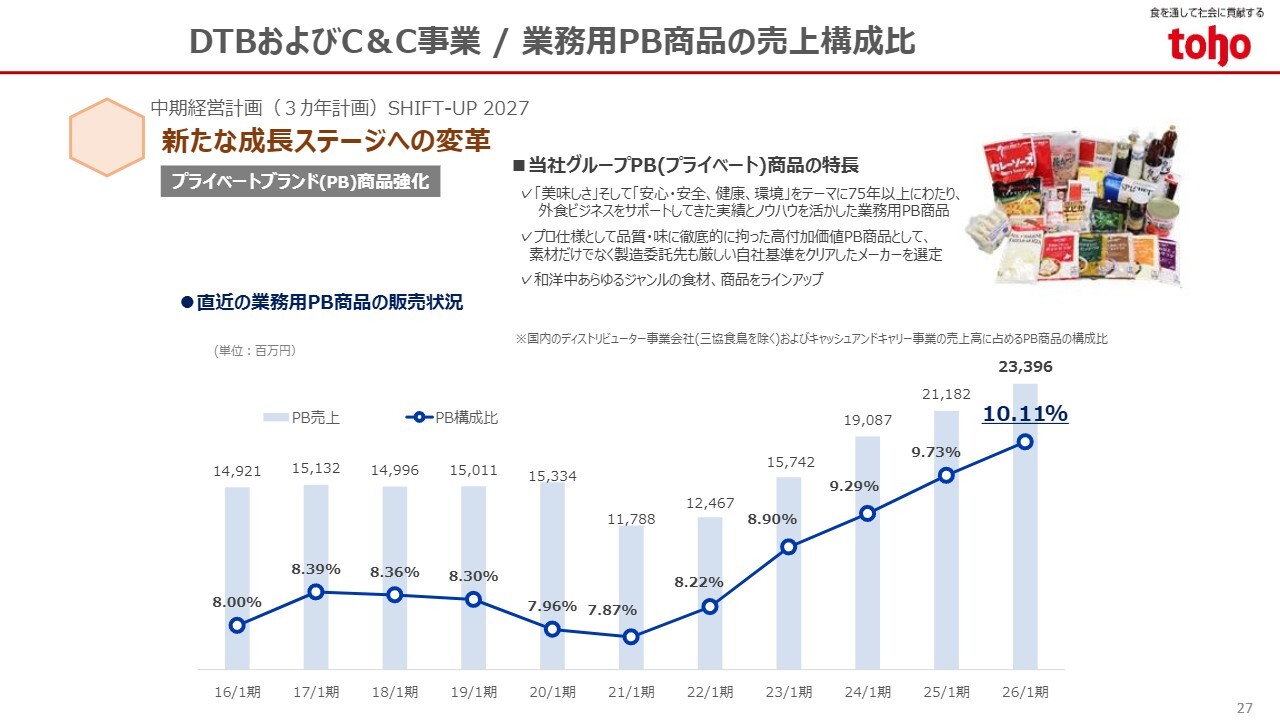 こちらのスライドは、お客さまにとってメニューの差別化、当社グループにとって粗利率向上につながる施策として、近年特に販売に注力しているプライベートブランド商品(以下、PB商品)の売上構成比の推移を示しています。