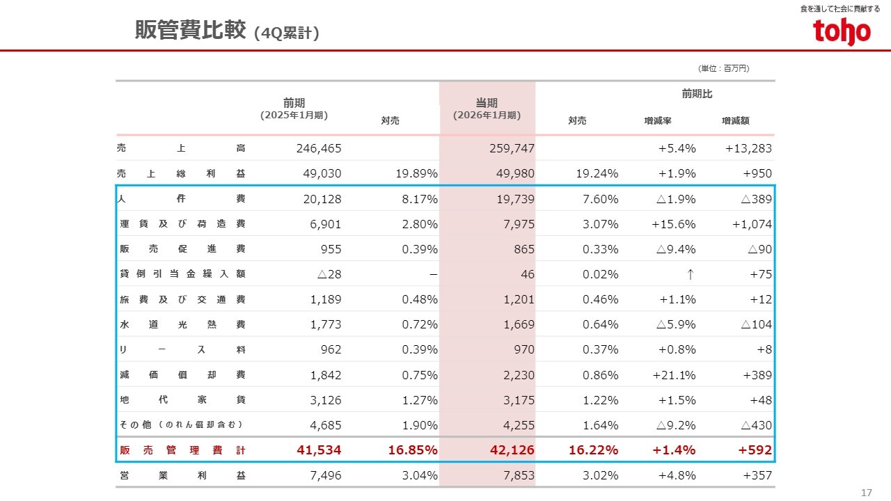 全体の販管費は、前期と比較して5億9,200万円増加しました。食品スーパー事業から撤退したことに伴い、人件費や水道光熱費などが減少しましたが、一方で物流費の上昇や設備投資により、運賃及び荷造費や減価償却費が増加しました。
