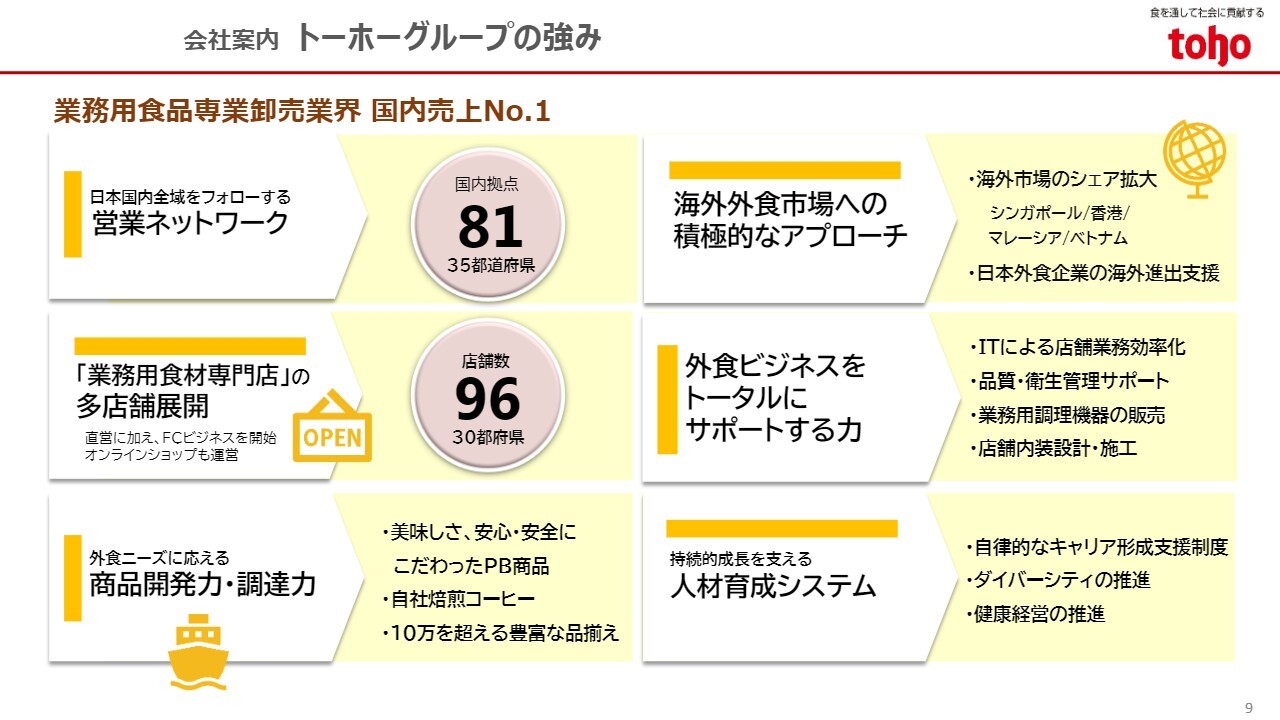 業務用食品卸売業界において、当社グループの規模感でこのような特長を有する企業は他になく、これが当社グループの強みであると考えています。
