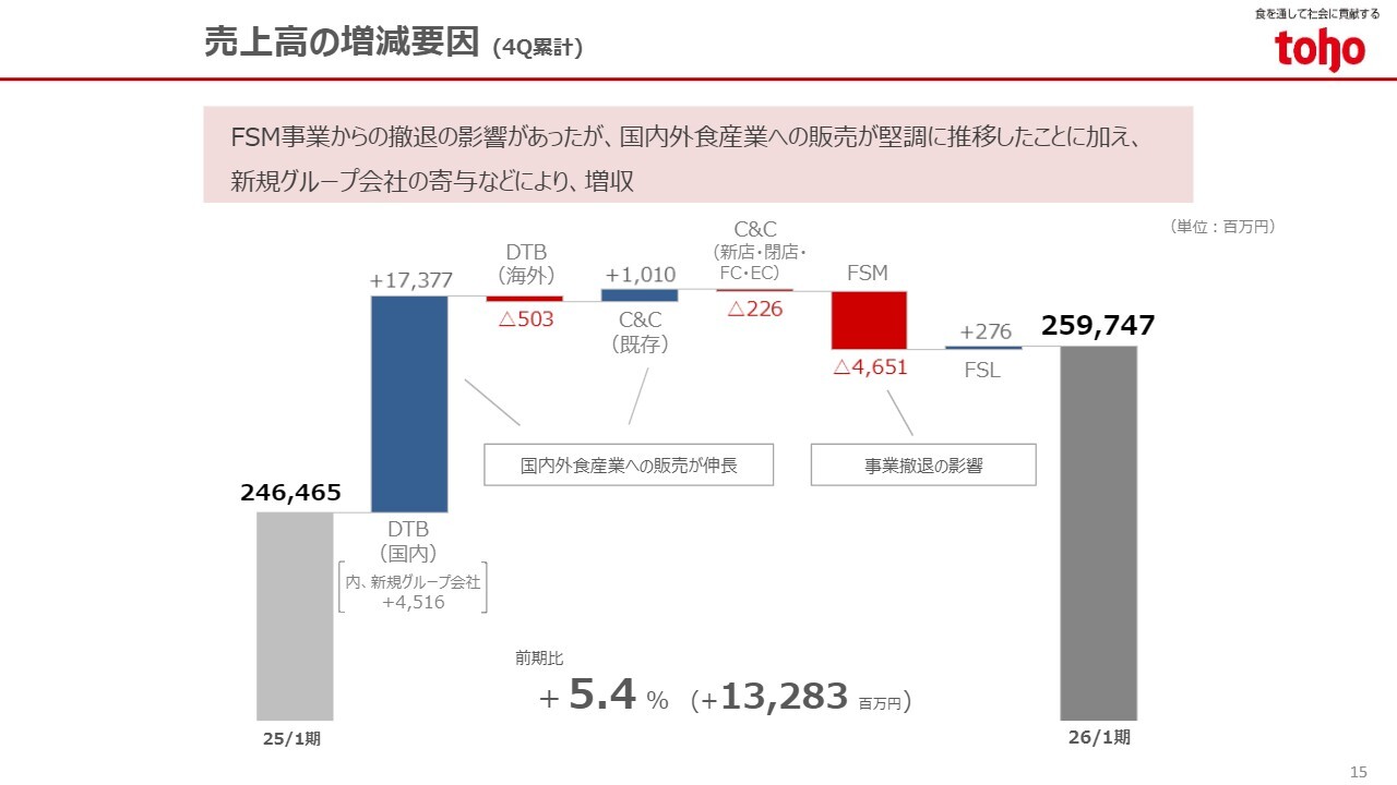 主な内容として、食品スーパー事業の撤退による減収がありましたが、一方で、国内外食産業向けディストリビューター事業の売上が173億7,700万円増加し、増収となりました。