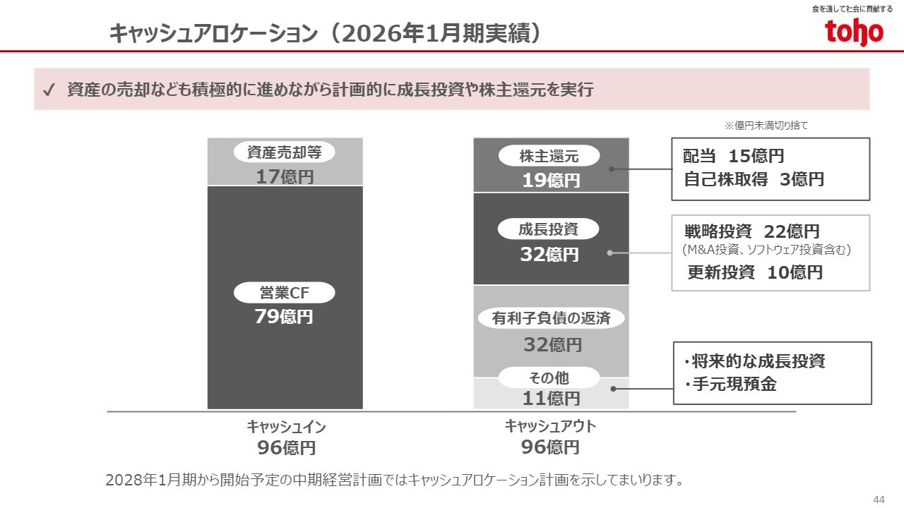 2028年1月期から開始予定の中期経営計画では、キャッシュアロケーション計画も開示していく予定です。今回は2026年1月期の実績のみ掲載していますので、ご参照ください。この後のスライドには、当社グループのサステナビリティへの取り組みも掲載しています。後ほどご覧いただければ幸いです。