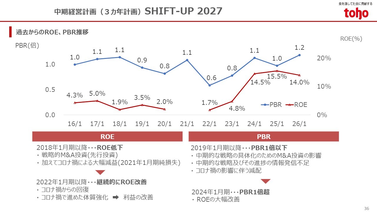本中期経営計画ではROE10パーセント以上、PBR1.0倍以上を目標に掲げており、直近の2026年1月期はROE14パーセント、PBR1.2倍ということで、このまま進めば目標をクリアできそうな状況です。