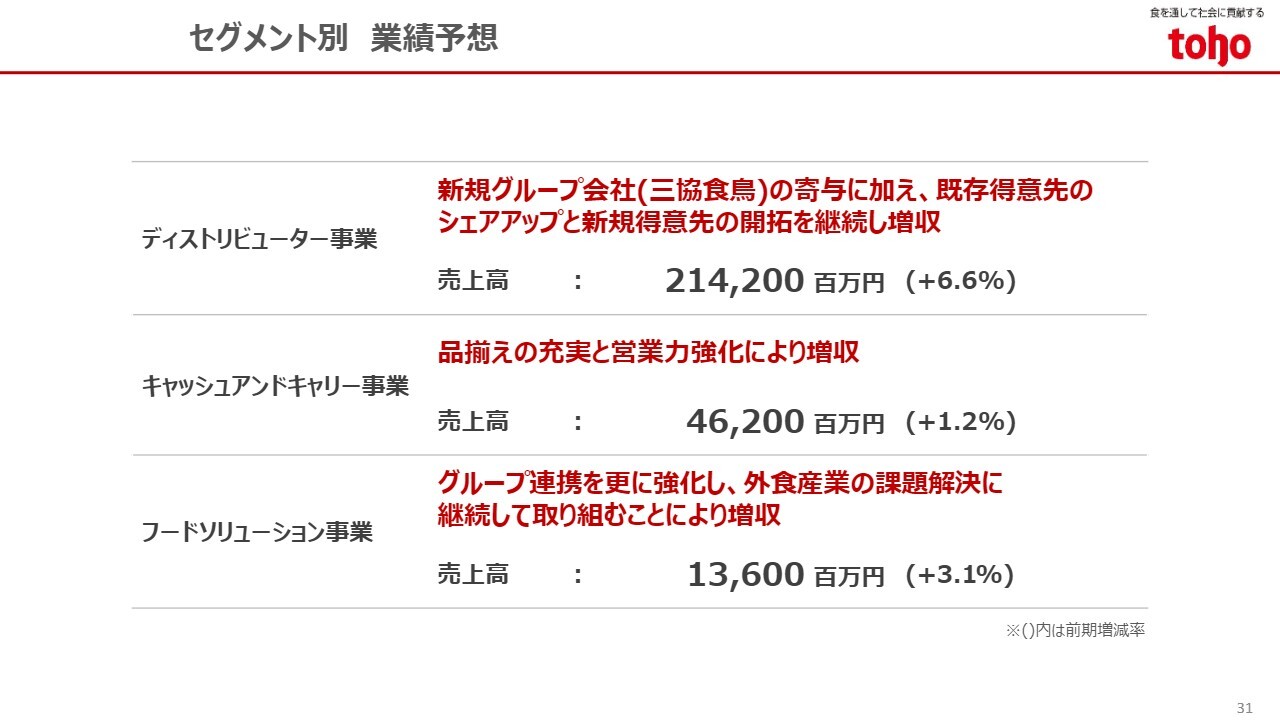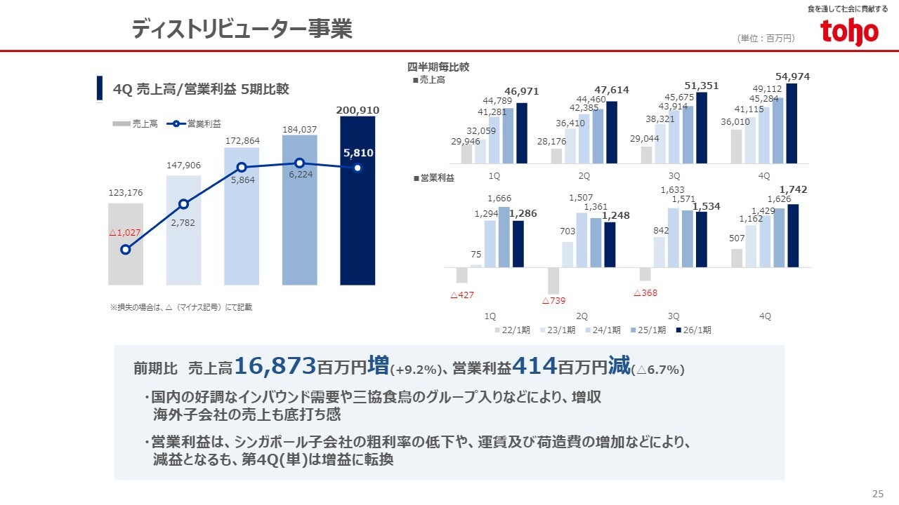 ディストリビューター事業では、インバウンド需要の活況などを背景に、国内外食産業向けの販売が堅調だったことに加え、三協食鳥がグループ入りしたことで、売上高は2,009億1,000万円、前期比9.2パーセント増となりました。