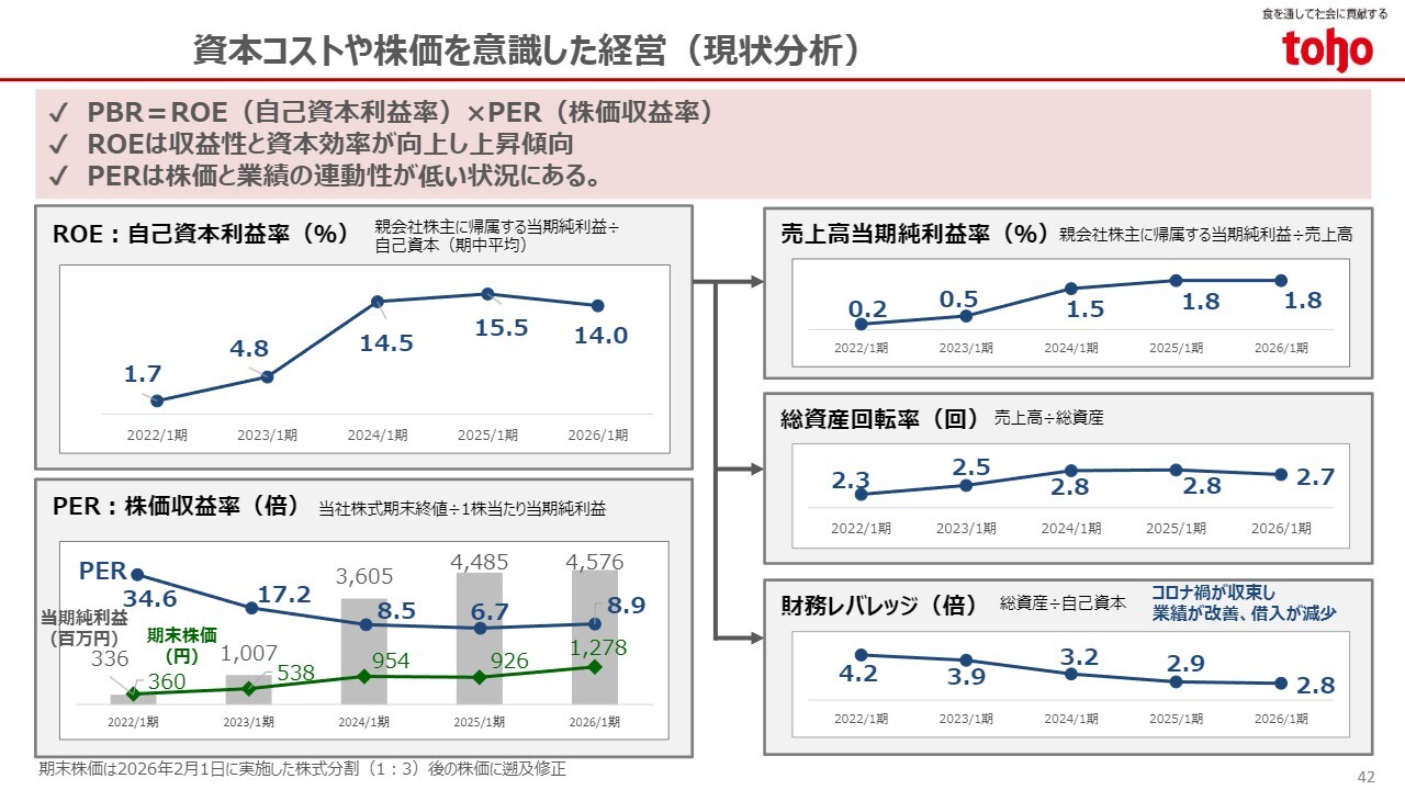 PBRをROEとPERに分解して考えると、ROEは収益性と資本効率が改善傾向にあり、このトレンドを継続できるように努めていきたいと考えています。一方で、PERについては業績の推移とトレンドが逆行している状況です。