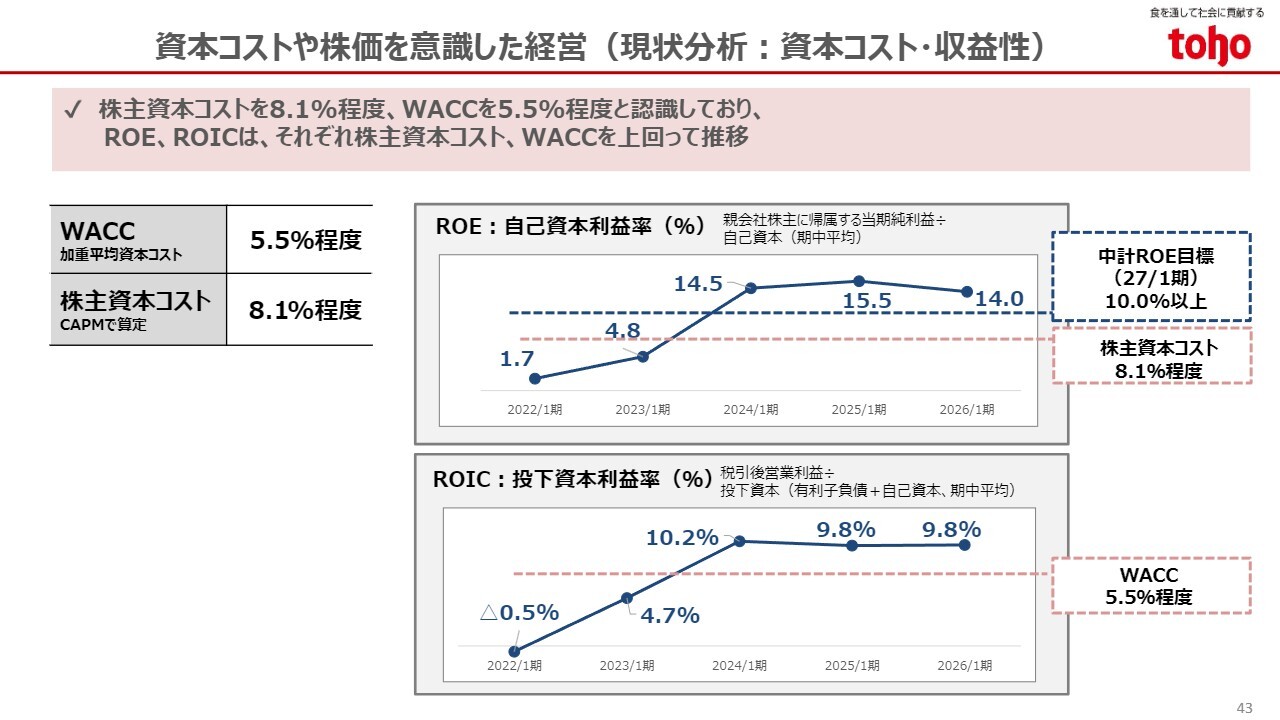 資本コストと収益性の現状分析についてです。現在、株主資本コストは8.1パーセント程度、WACCは5.5パーセント程度と認識していますが、ROEやROICは、それぞれ株主資本コストやWACCを上回って推移しています。引き続き、成長への投資を行いながら収益力の向上に取り組んでいきます。